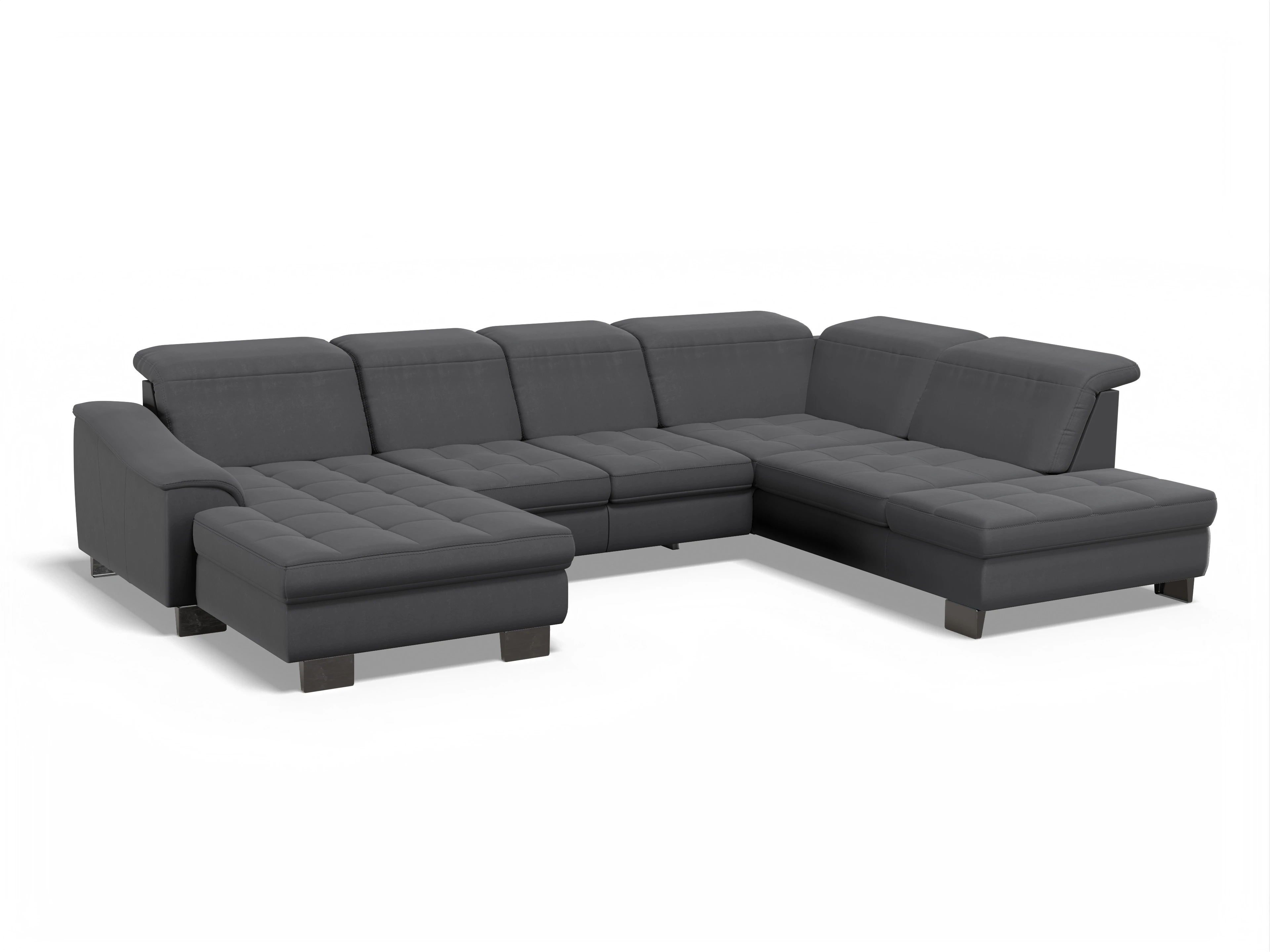 Die Wohnlandschaft besteht aus einem Canape, einem 2,5-Sitzer mittig und einem 1,5-Sitzer Kombielement mit Anstellhocker rechts. Die Kopfpolsterverstellung kommt inklusive dazu.
