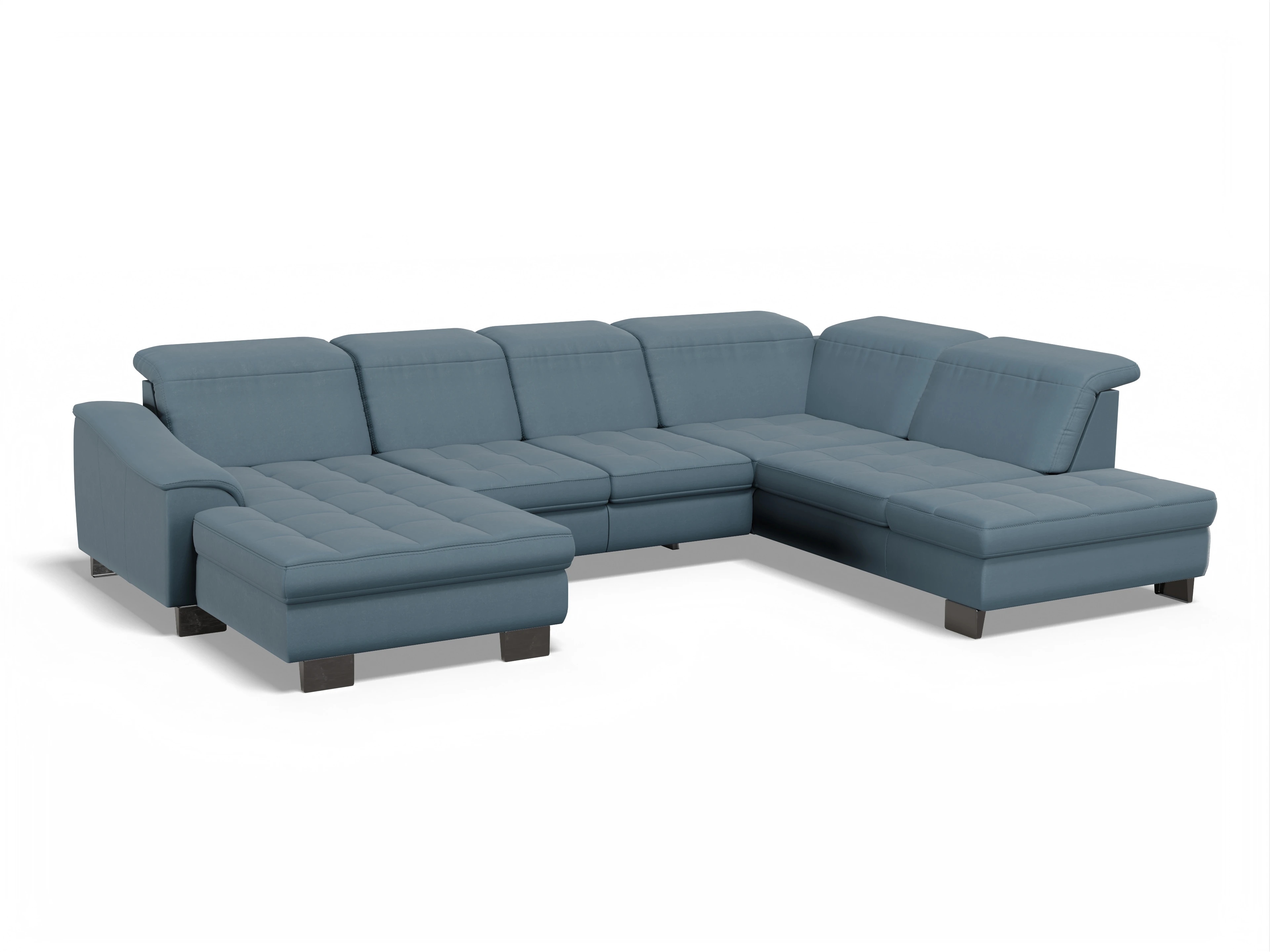 Die Wohnlandschaft besteht aus einem Canape, einem 2,5-Sitzer mittig und einem 1,5-Sitzer Kombielement mit Anstellhocker rechts. Die Kopfpolsterverstellung kommt inklusive dazu.