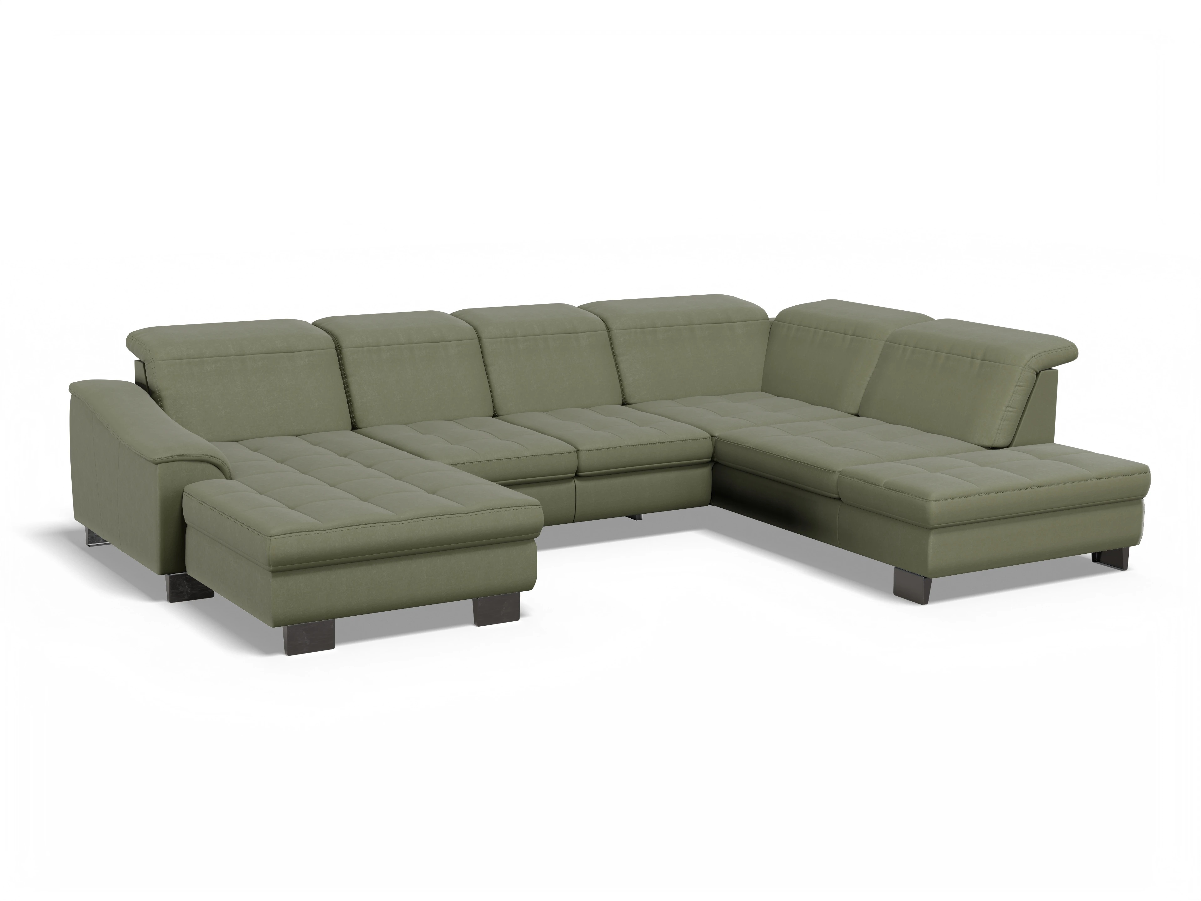 Die Wohnlandschaft besteht aus einem Canape, einem 2,5-Sitzer mittig und einem 1,5-Sitzer Kombielement mit Anstellhocker rechts. Die Kopfpolsterverstellung kommt inklusive dazu.