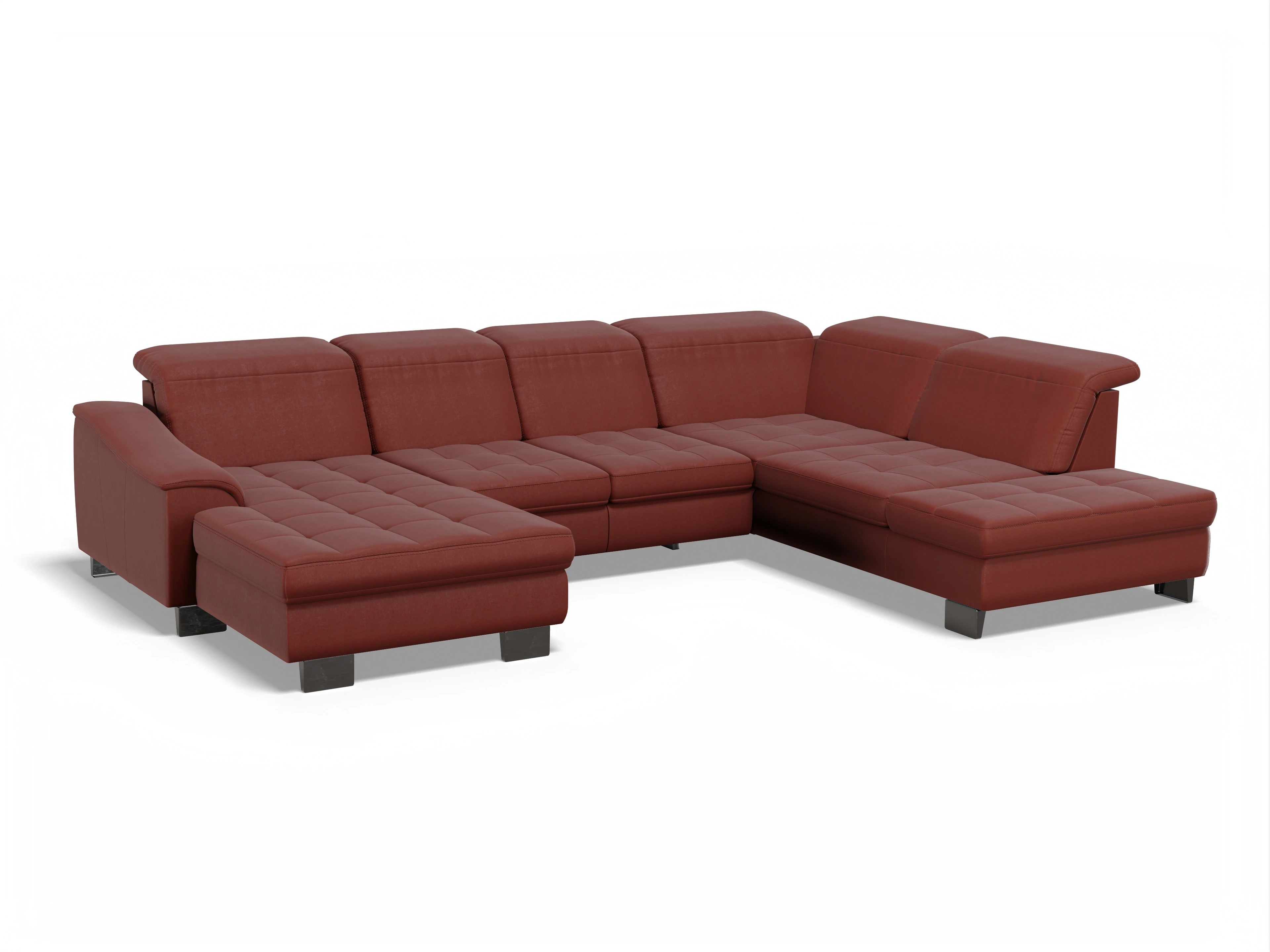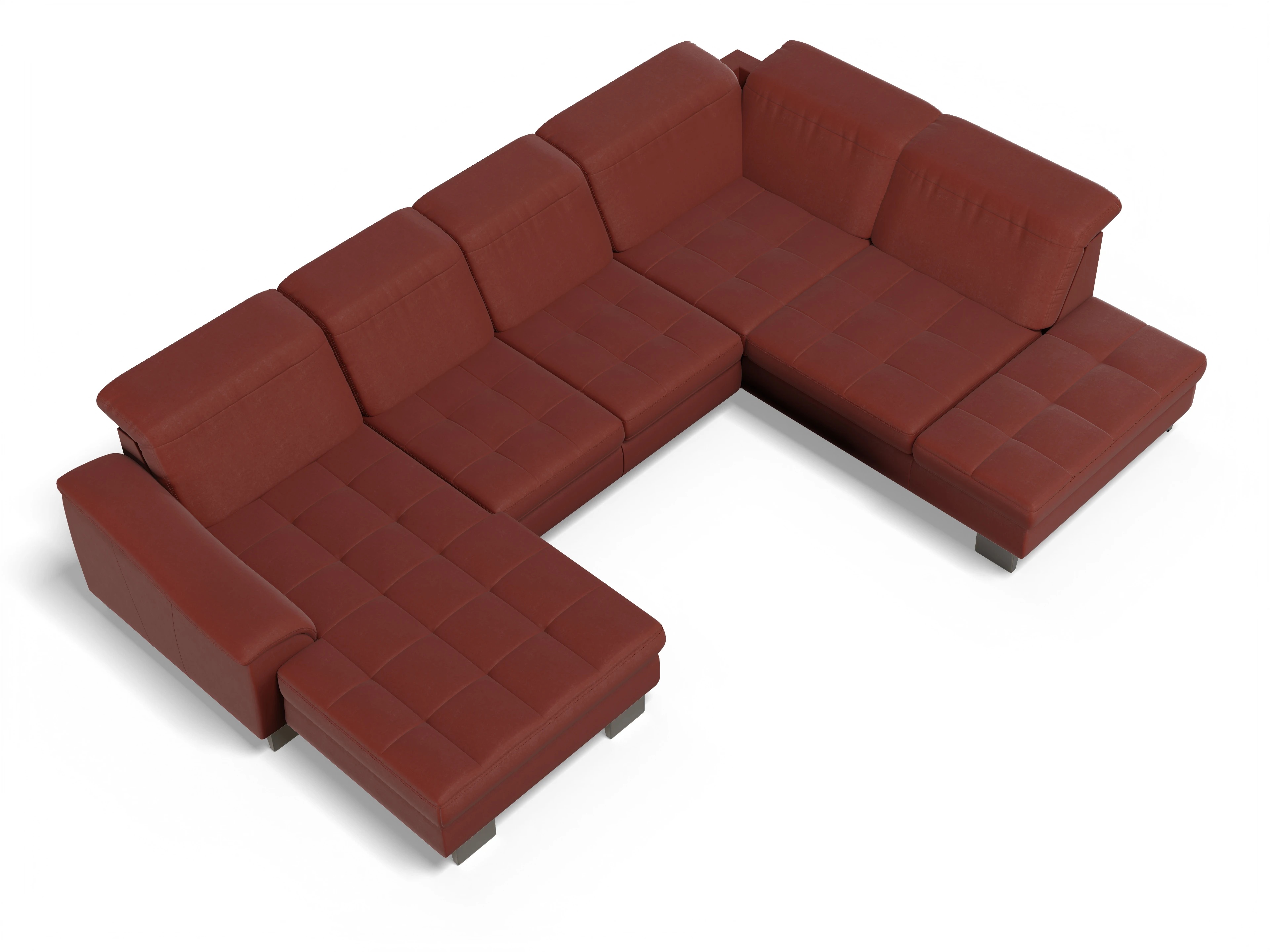 Die Wohnlandschaft besteht aus einem Canape, einem 2,5-Sitzer mittig und einem 1,5-Sitzer Kombielement mit Anstellhocker rechts. Die Kopfpolsterverstellung kommt inklusive dazu.
