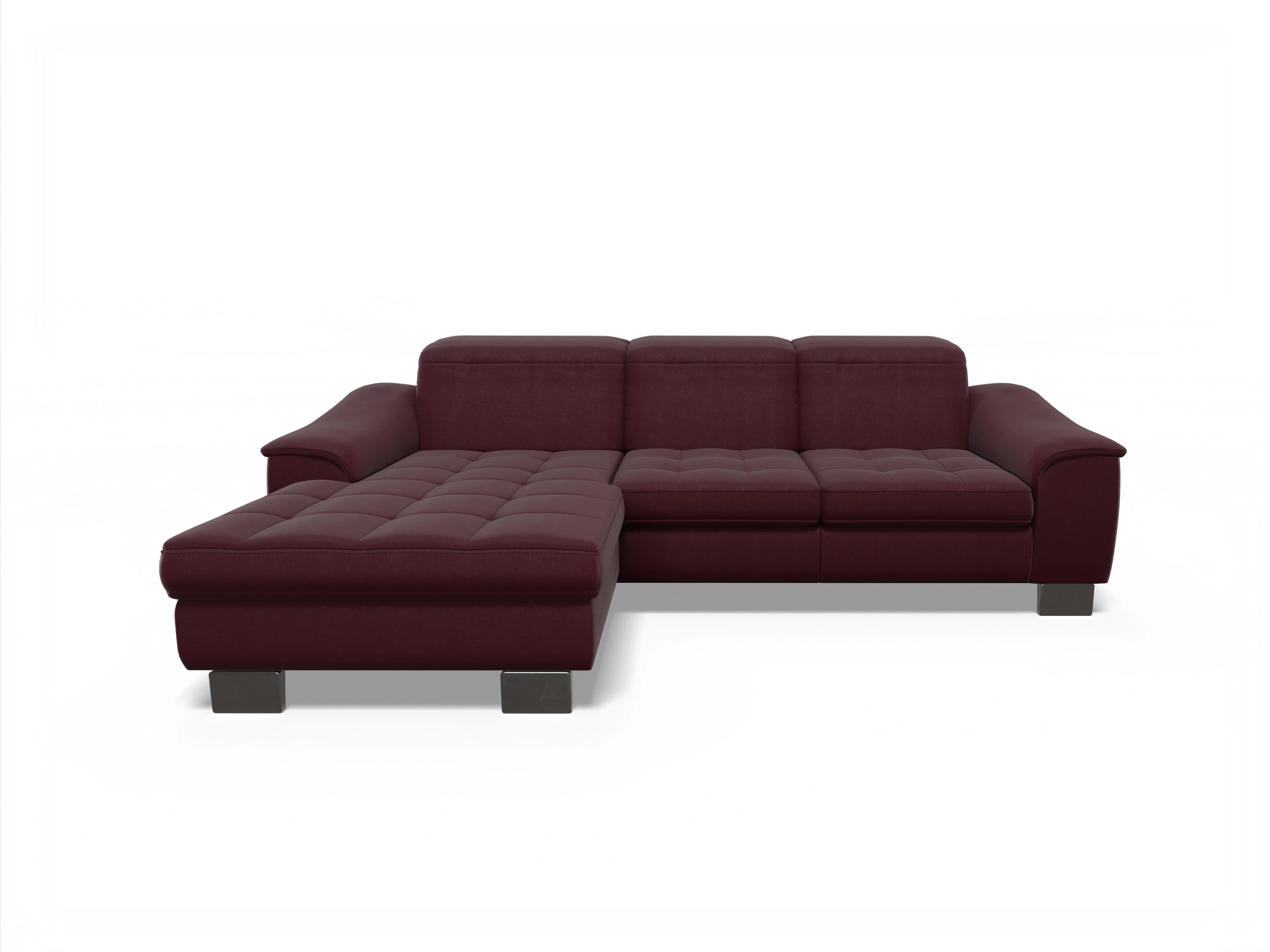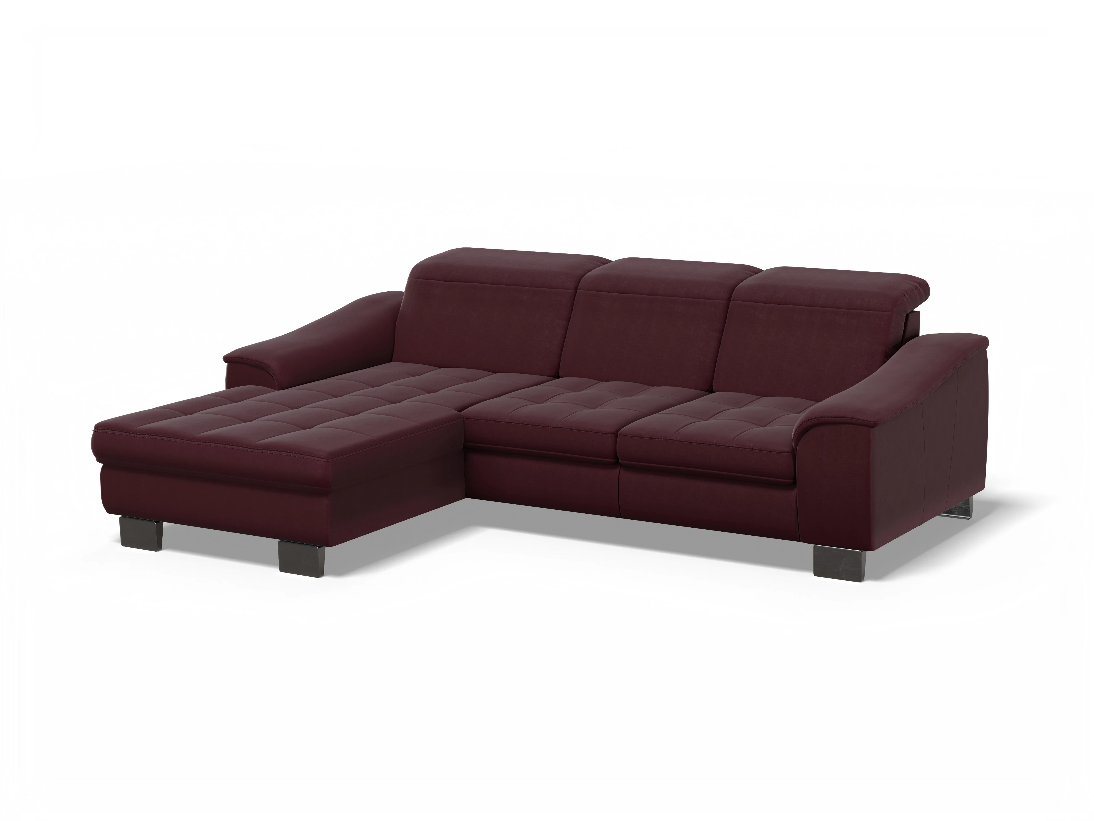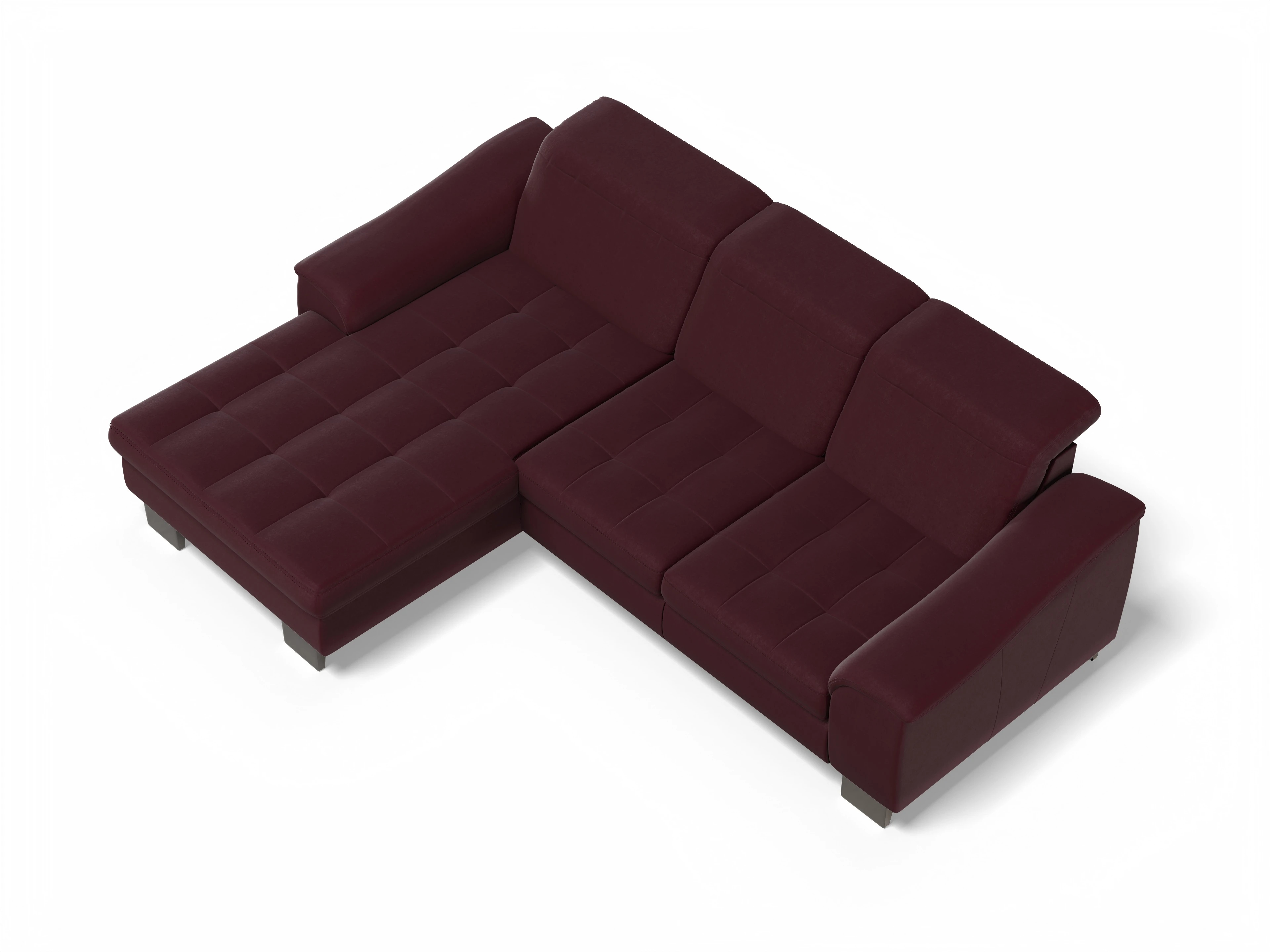 Das Ecksofa besteht aus einem Canapé mit Armlehne links und einem 2,5-Sitzer mit Armlehne rechts. Die Kopfpolsterverstellung kommt inklusive dazu.