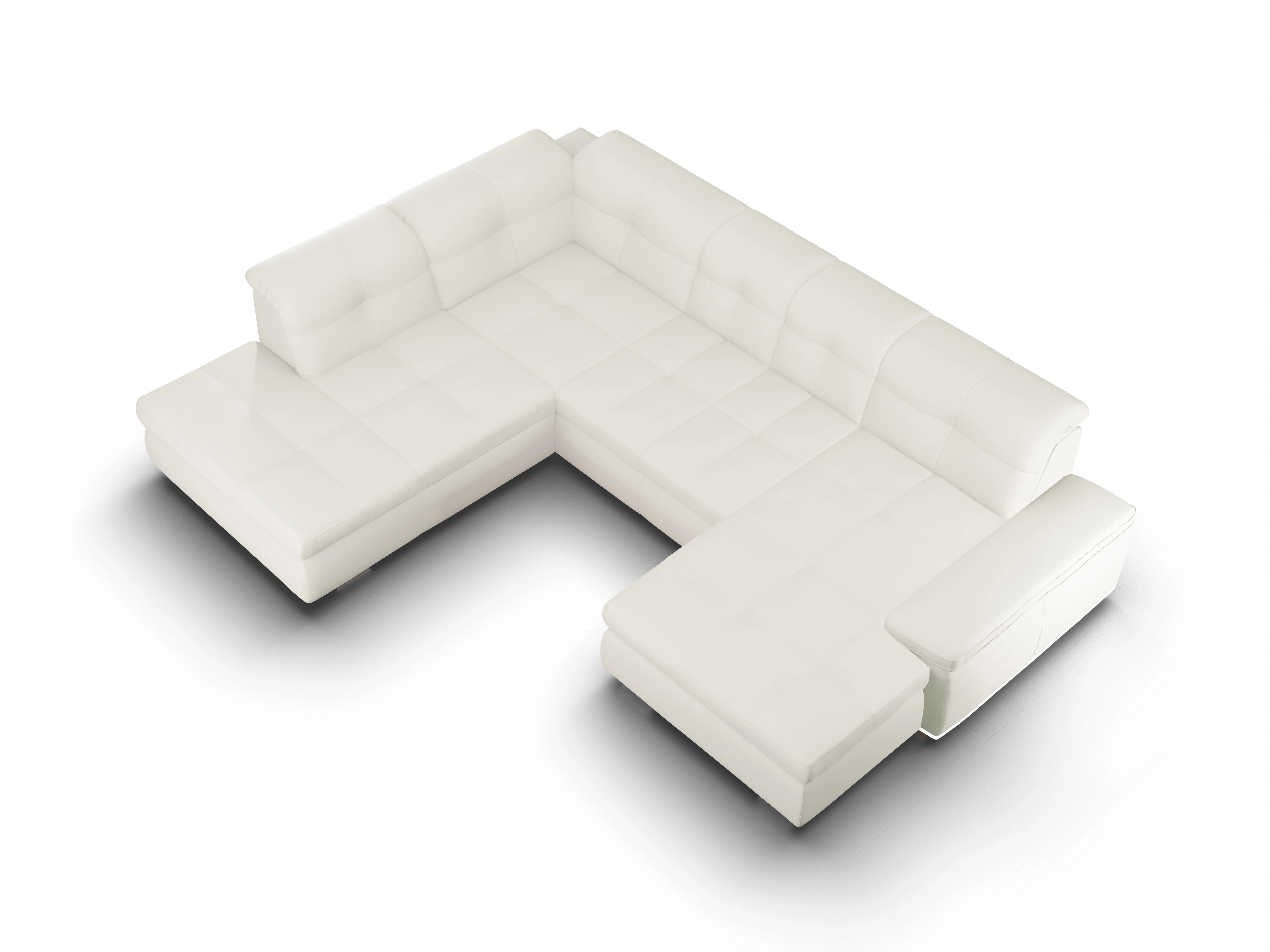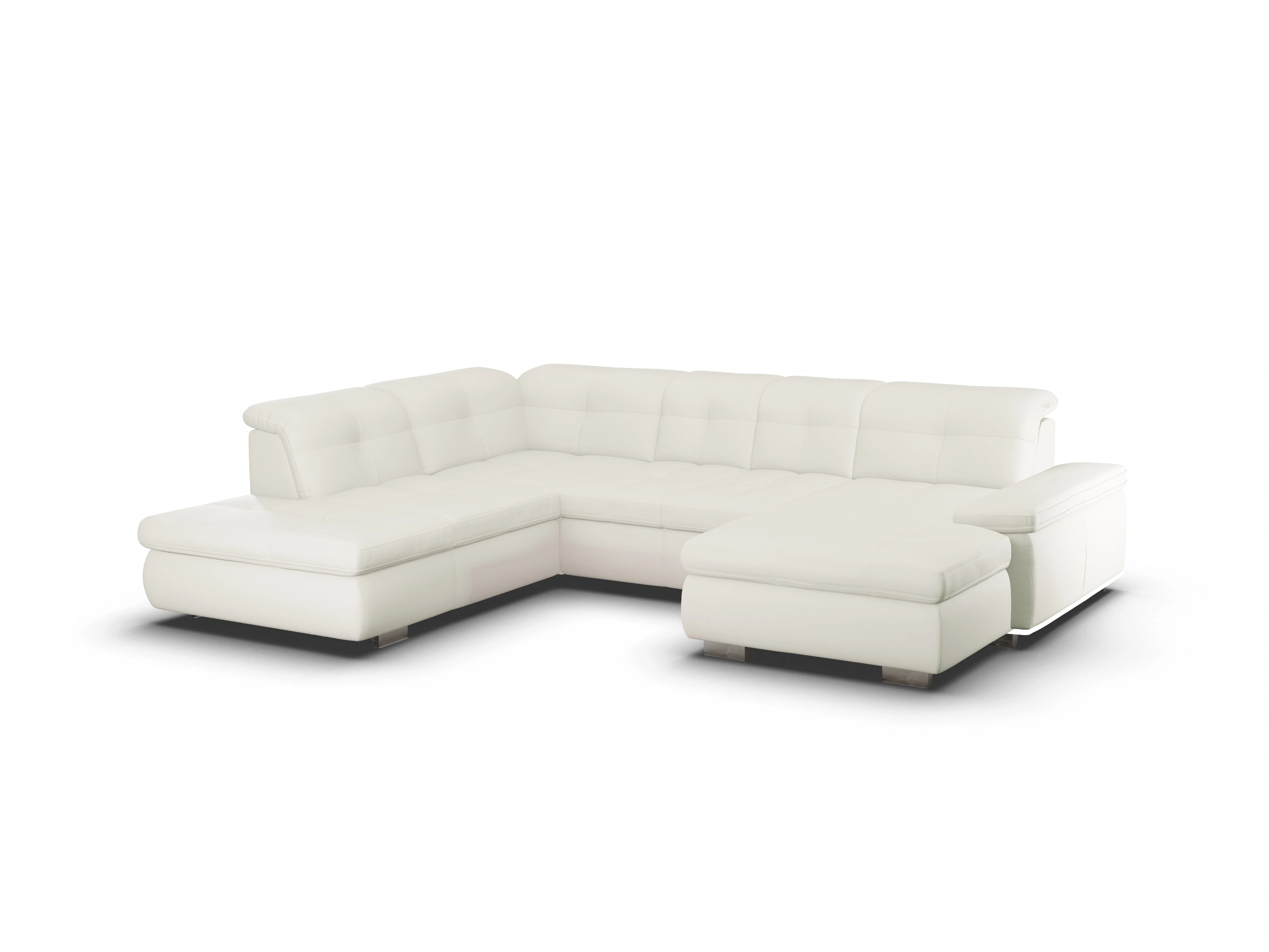 Die Wohnlandschaft besteht aus einem 1,5-Sitzer Anstellhocker links, wahlweise mit Stauraum und Schubkasten, einer Spitzecke, einem 2-Sitzer mittig, wahlweise mit einer Schlaffunktion und Canape mit Armlehne, ebenfalls mit möglichem Stauraum. Der 2-Sitzer, das Canape und der Anstellhocker kommen mit einer Sitztiefenverstellung.