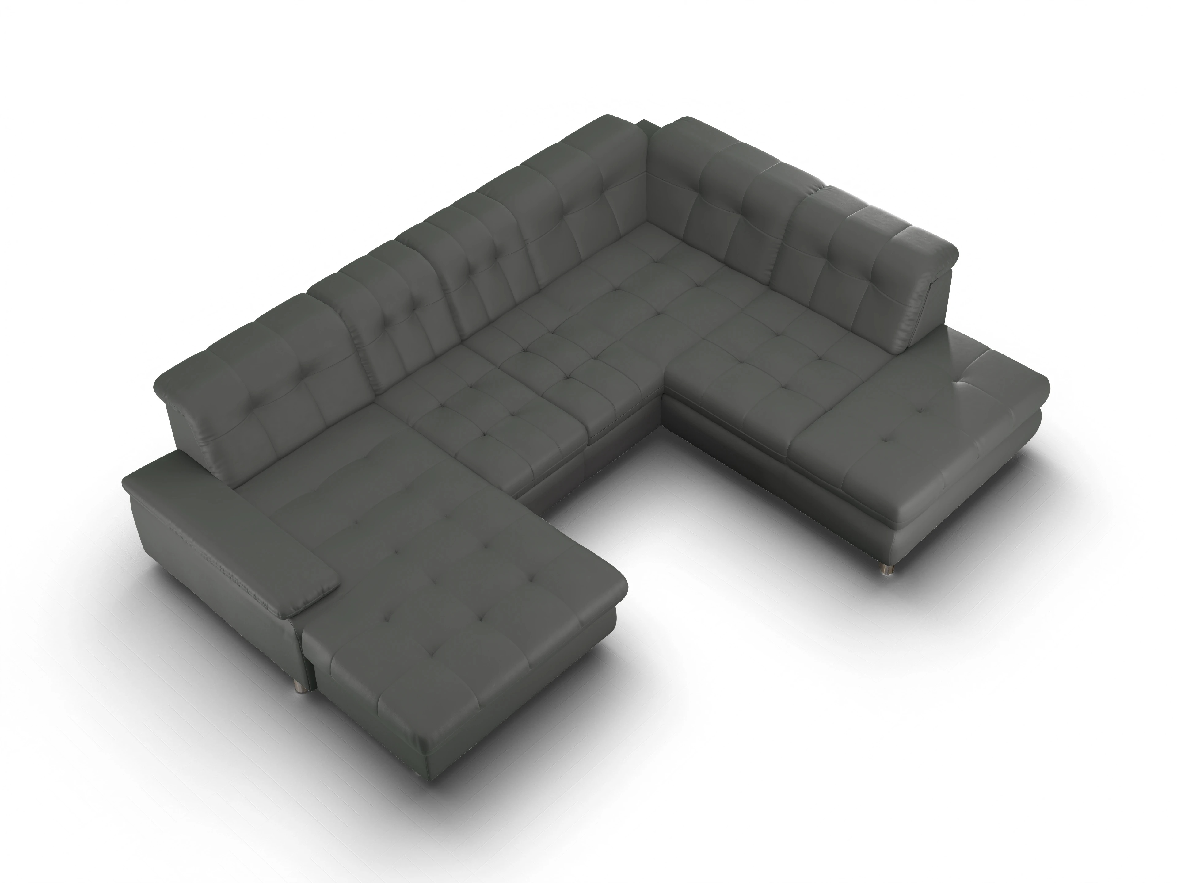 Die Wohnlandschaft besteht aus einem Canape mit Armlehne links, wahlweise mit Stauraum, einem 2-Sitzer mittig, wahlweise mit einer Schlaffunktion, einer Spitzecke und einem 1,5-Sitzer Anstellhocker, ebenfalls mit möglichem Stauraum und Schubkasten. Der 2-Sitzer, das Canape und der Anstellhocker kommen mit einer Sitztiefenverstellung.
