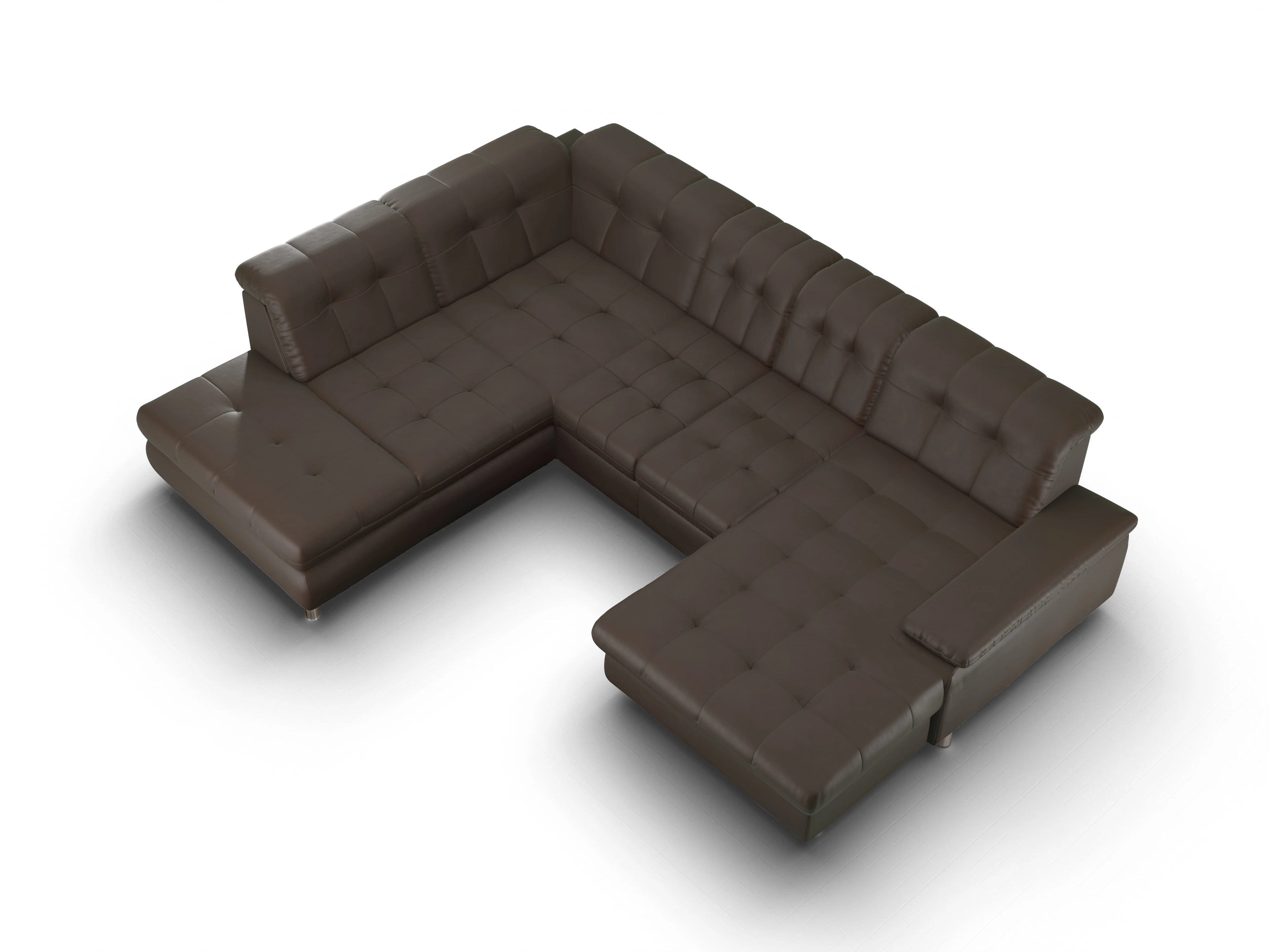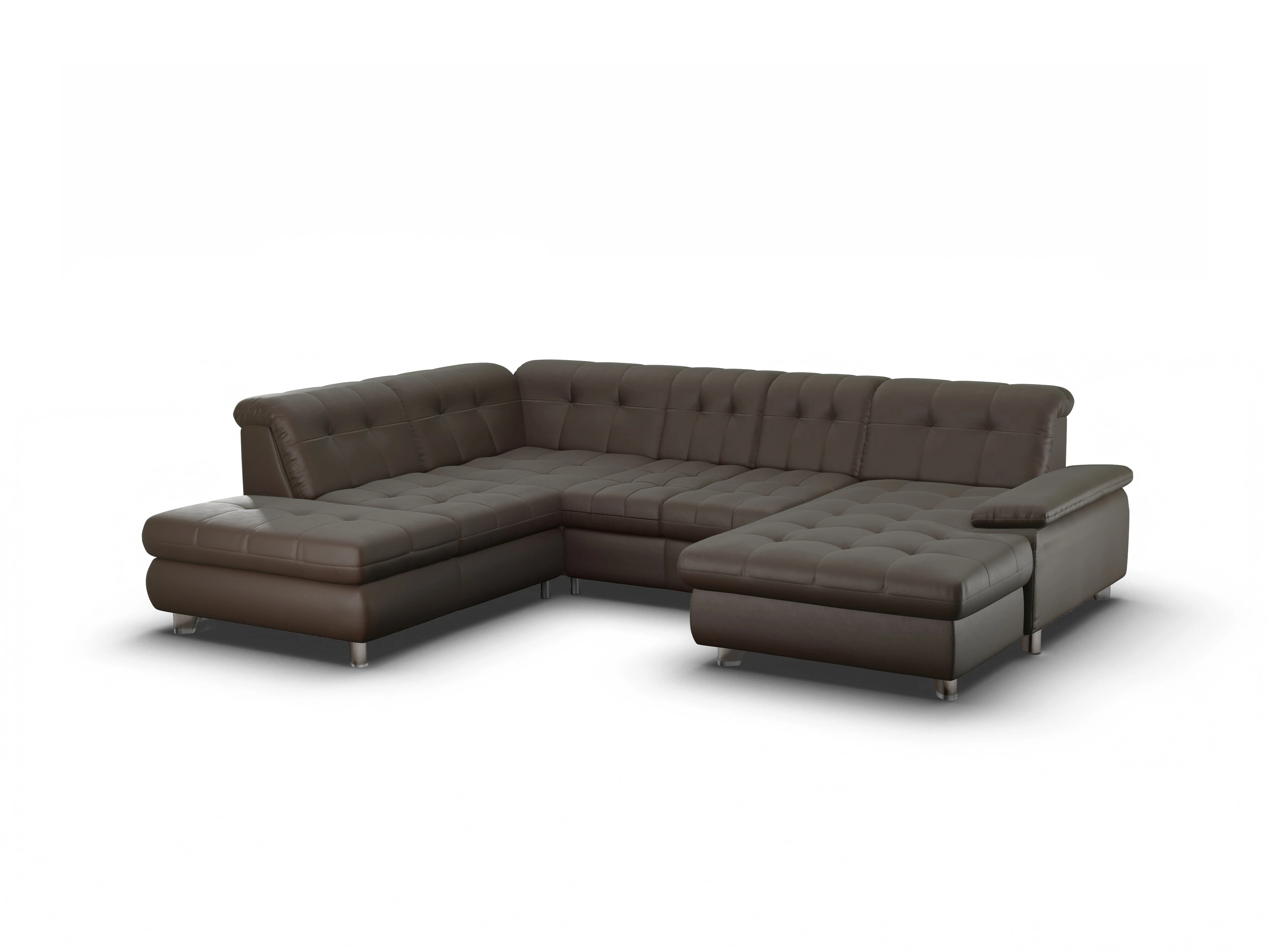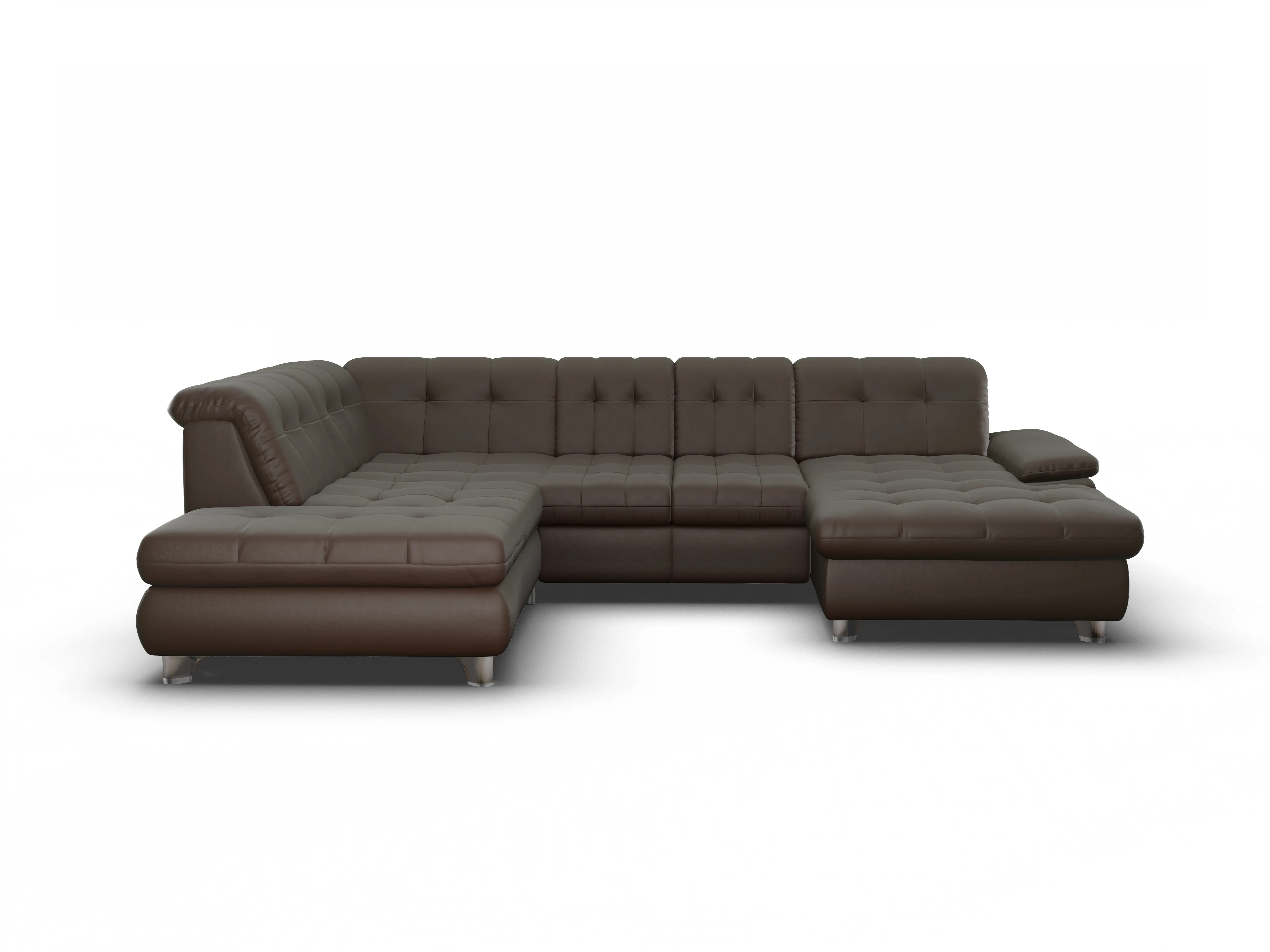 Die Wohnlandschaft besteht aus einem 1,5-Sitzer Anstellhocker links, wahlweise mit Stauraum und Schubkasten, einer Spitzecke, einem 2-Sitzer mittig, wahlweise mit einer Schlaffunktion und Canape mit Armlehne, ebenfalls mit möglichem Stauraum. Der 2-Sitzer, das Canape und der Anstellhocker kommen mit einer Sitztiefenverstellung.
