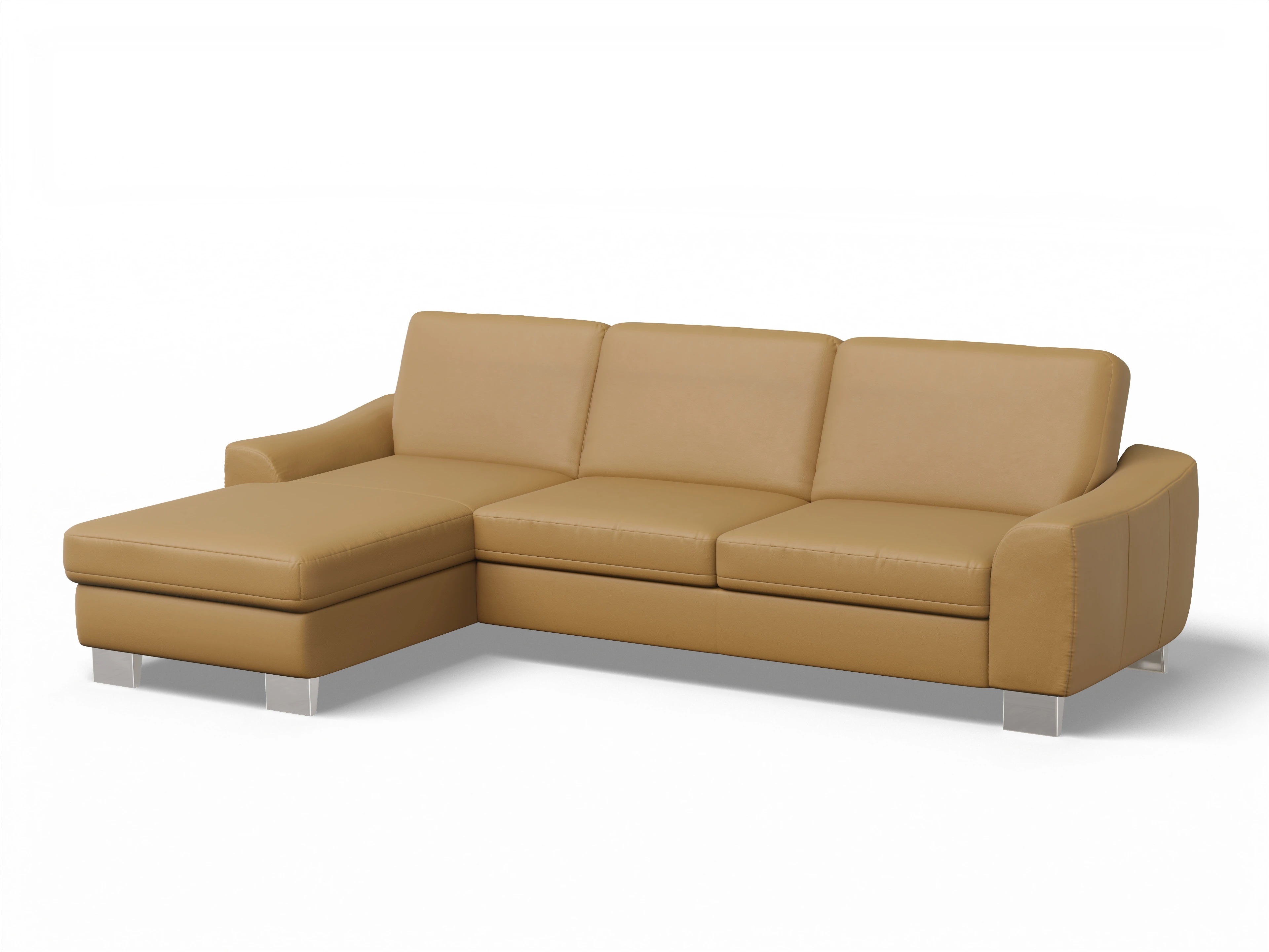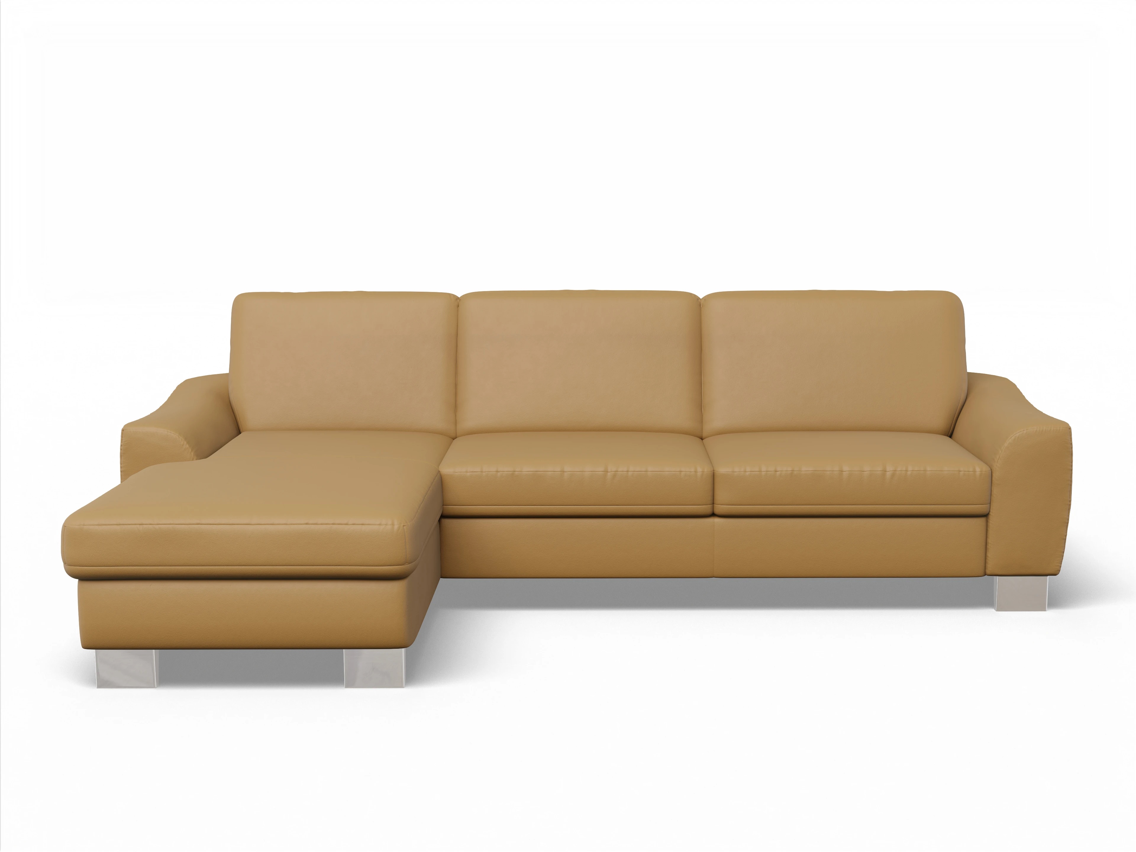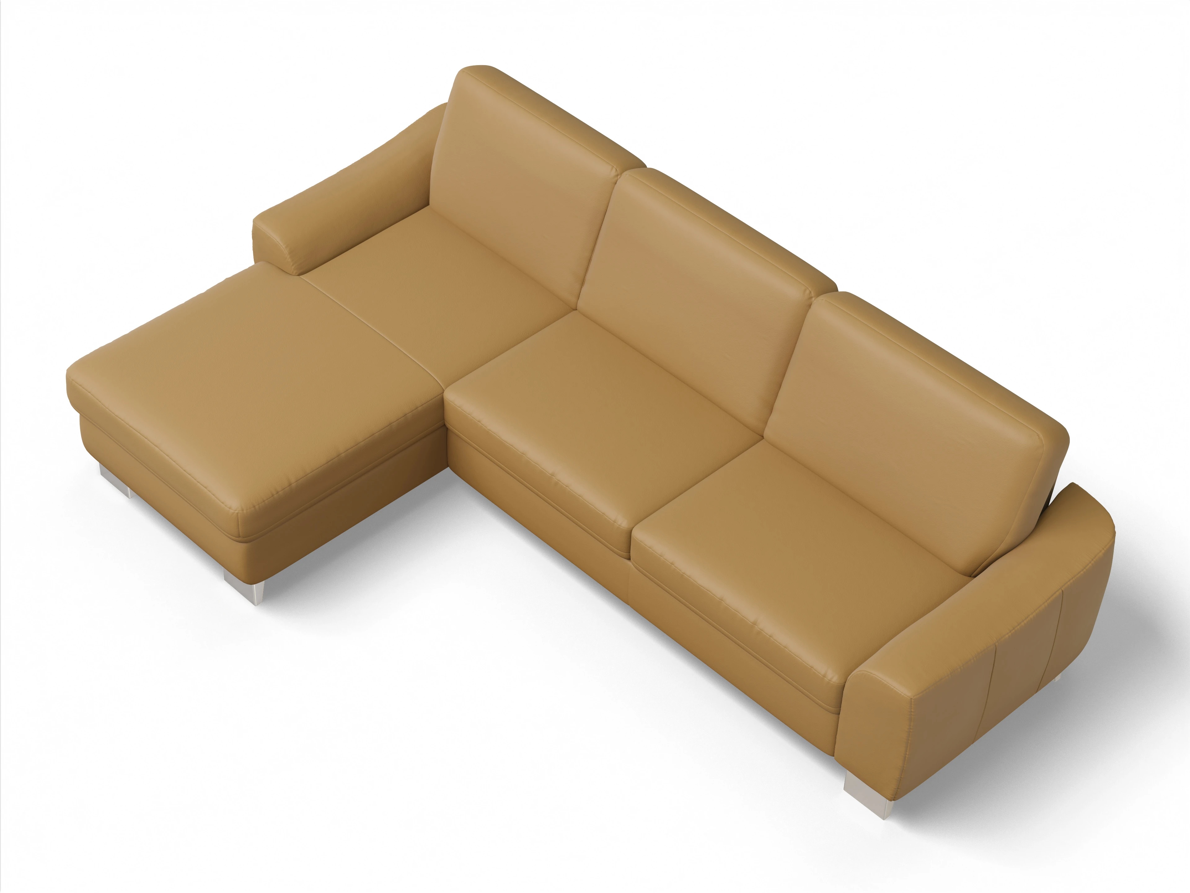 Das Ecksofa besteht aus einem Canape mit einer Armlehne links, wahlweise mit Stauraum und einem 3-Sitzer mit einer Armlehne rechts, wahlweise mit Schlaffunktion oder Relaxfunktion.