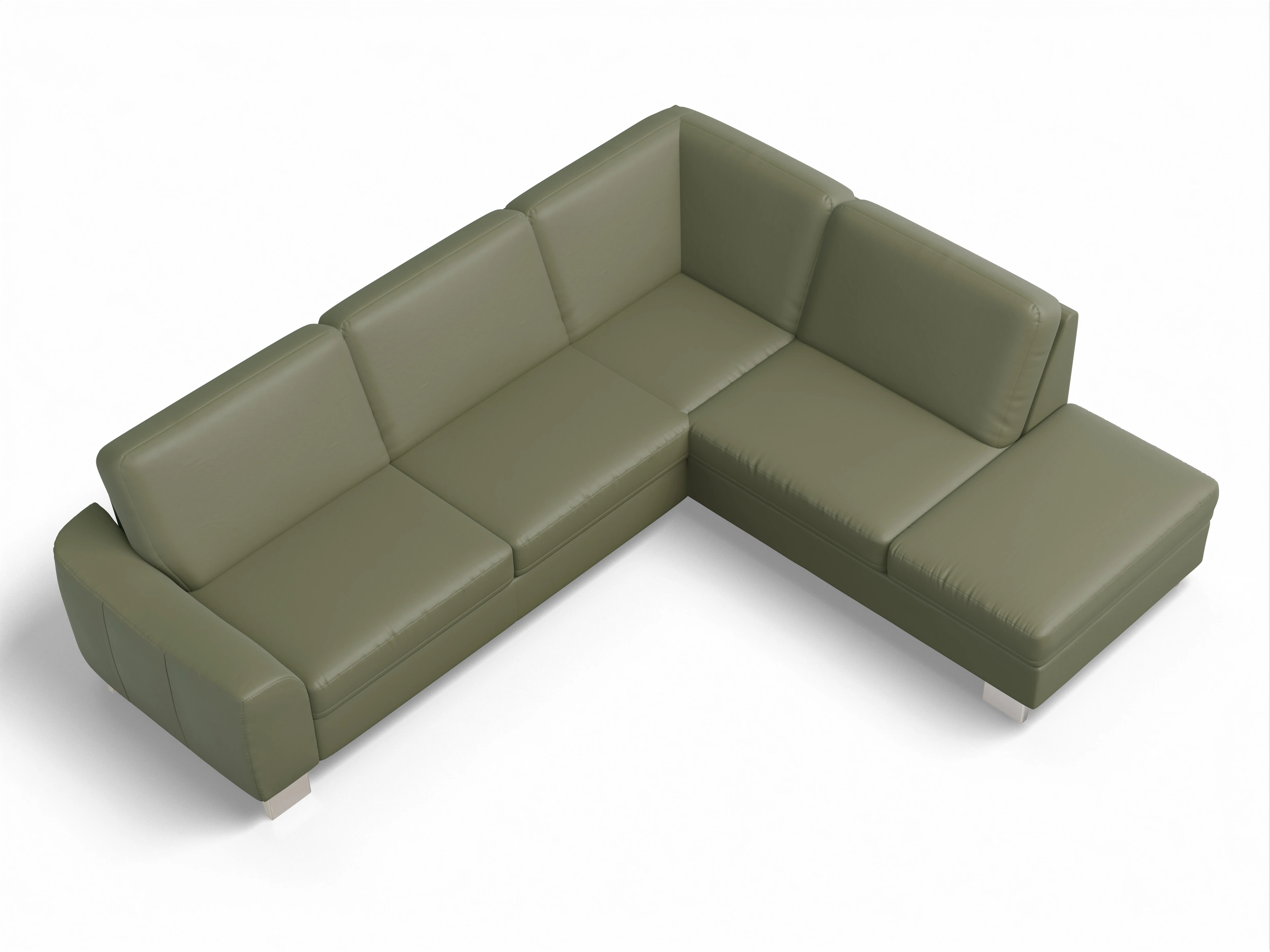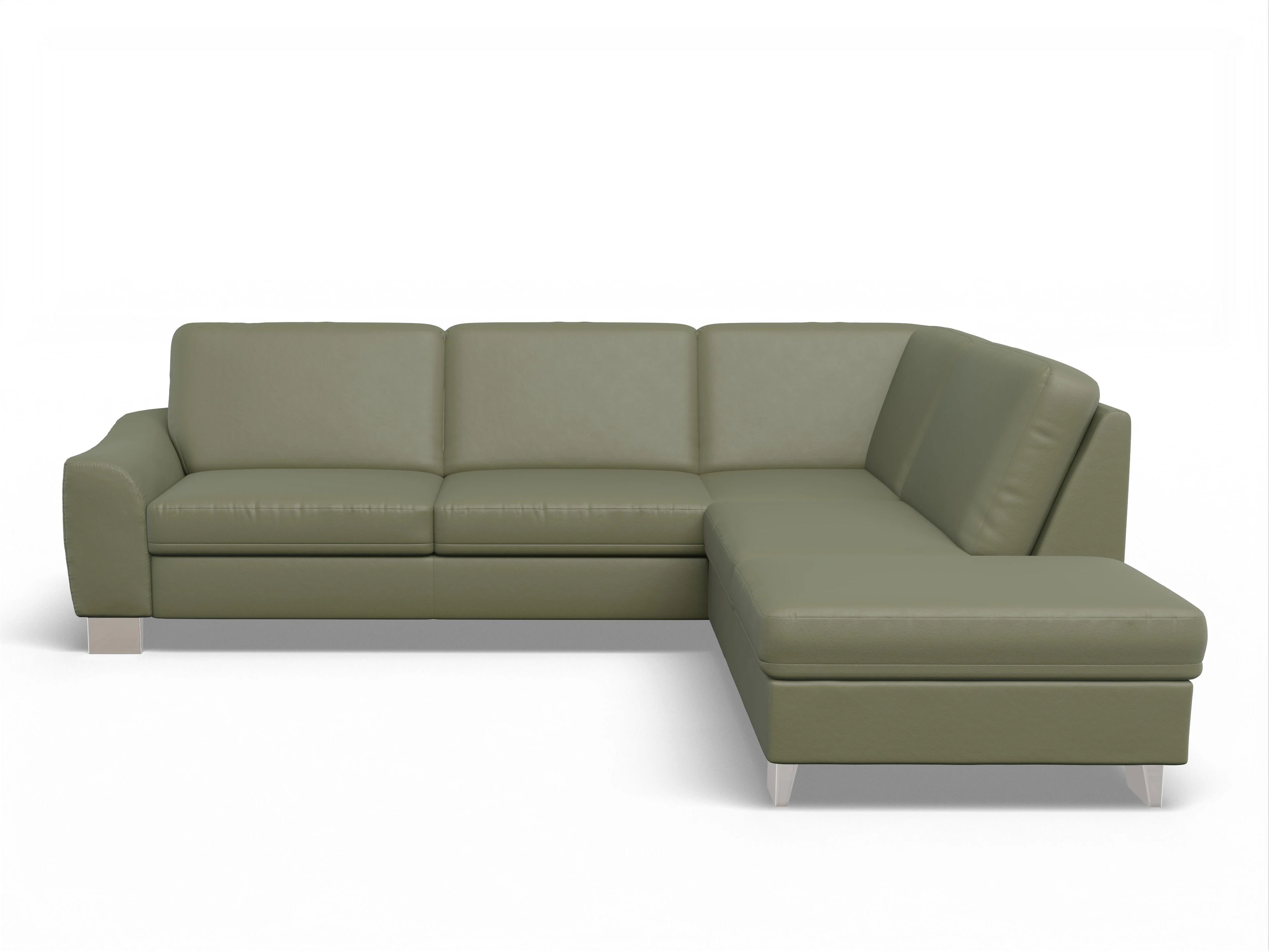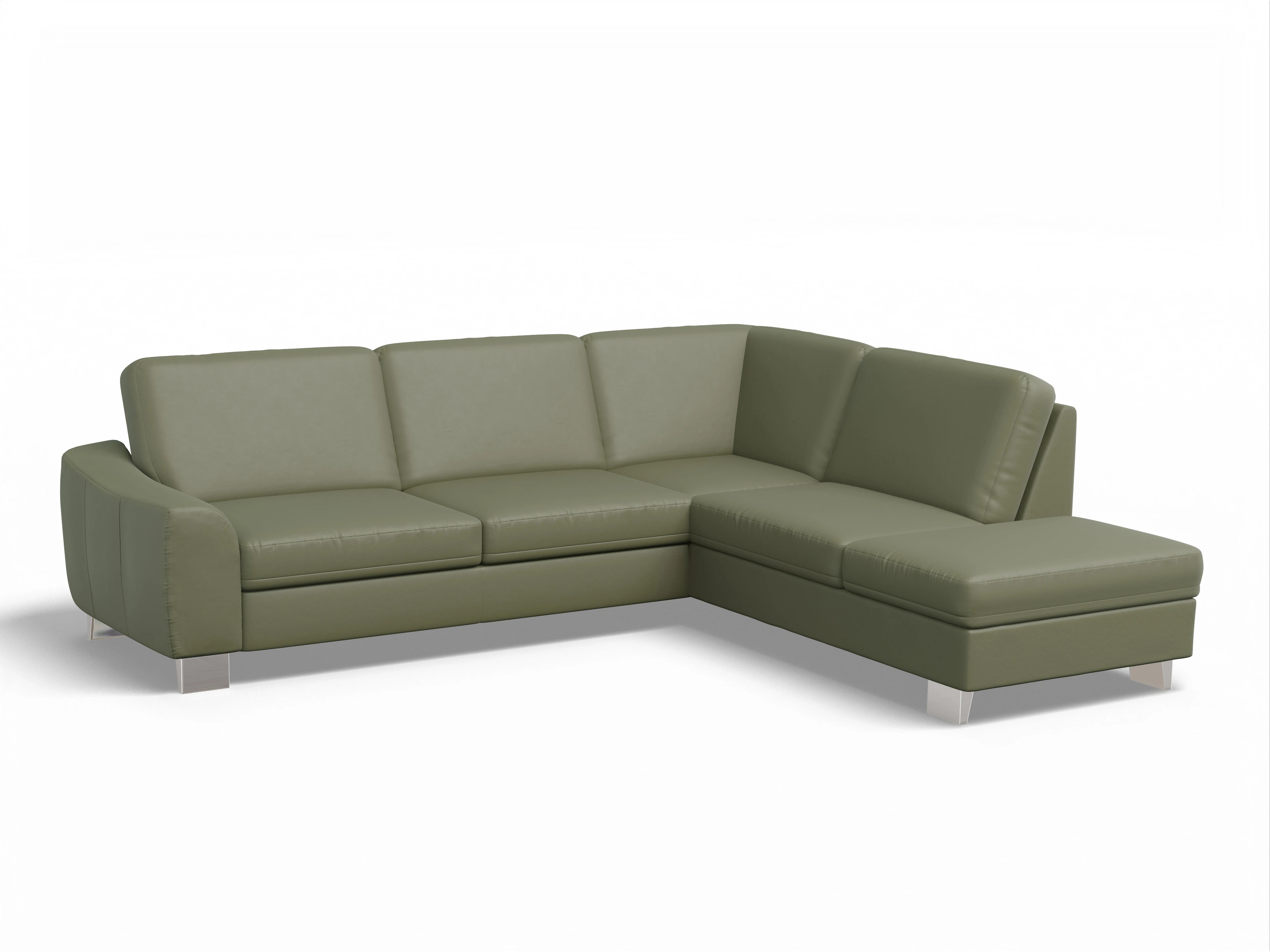 Das Ecksofa besteht aus einem 3-Sitzer mit einer Armlehne links, wahlweise mit Schlaffunktion und einem Kombielement mit Anstellhocker, wahlweise mit Stauraum und Schubkasten.
