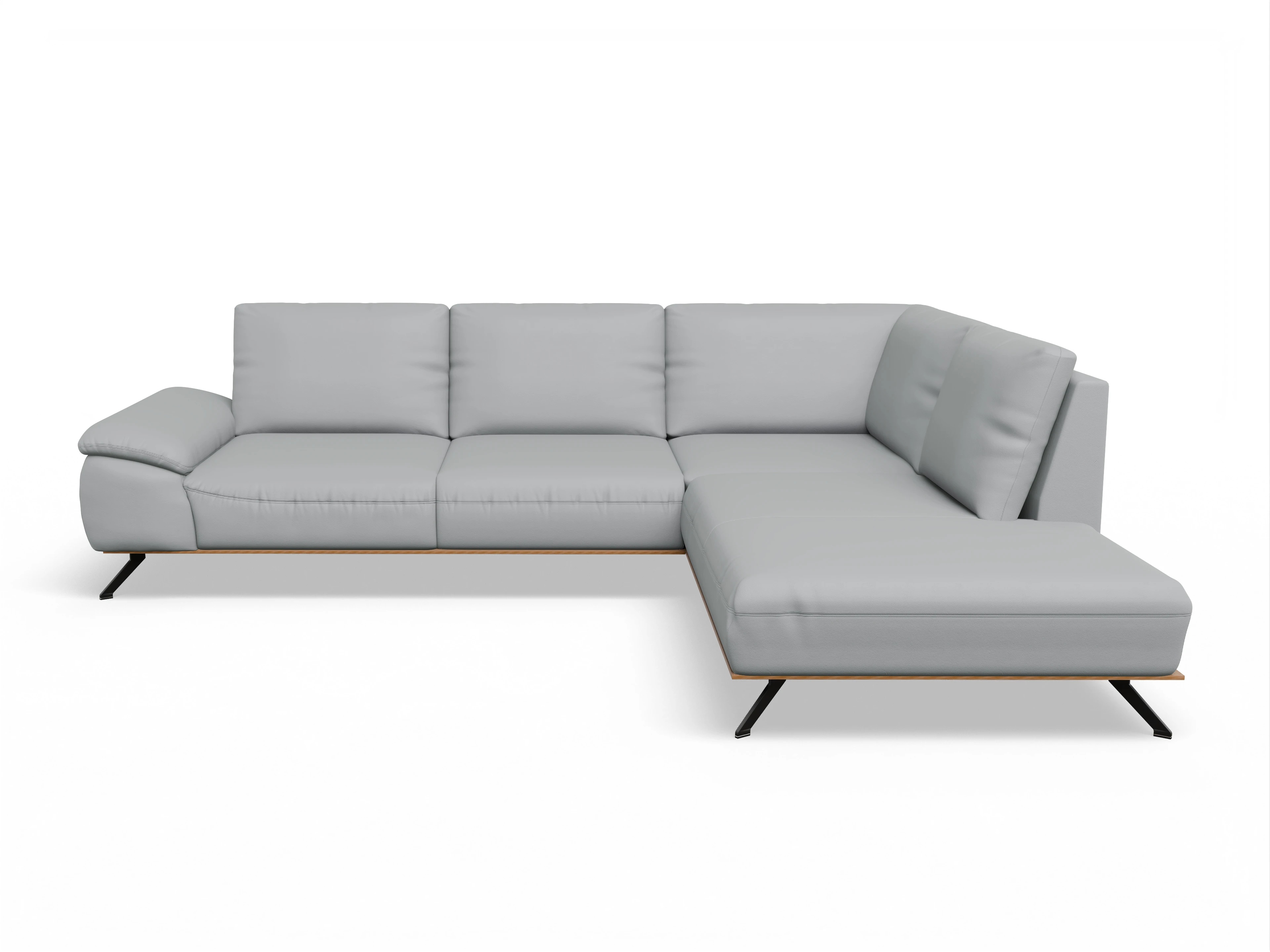 Das Ecksofa besteht aus einem 3-Sitzer mit Armlehne links, einer Spitzecke und einem 1,5-Sitzer mit Anstellhocker rechts.