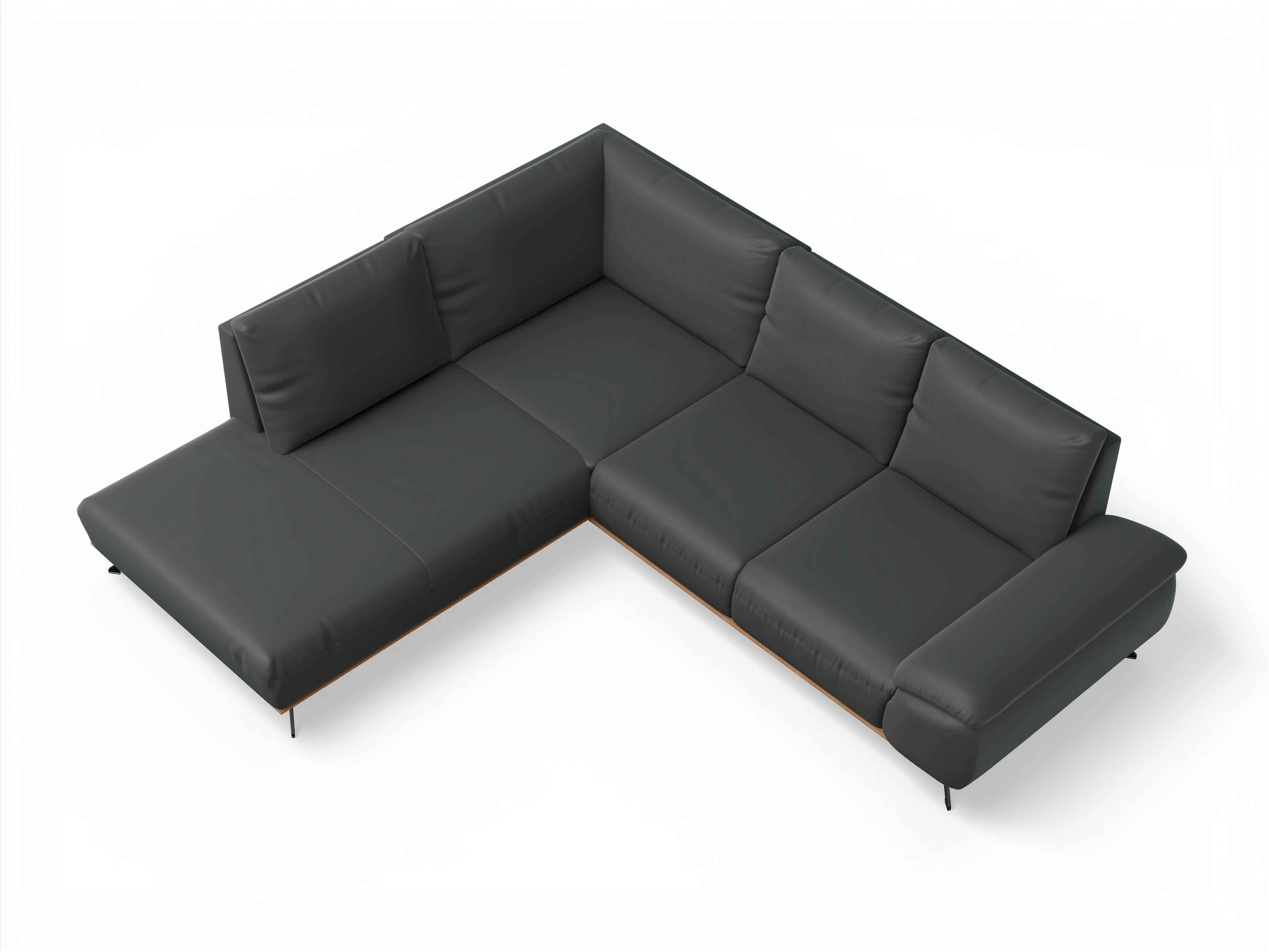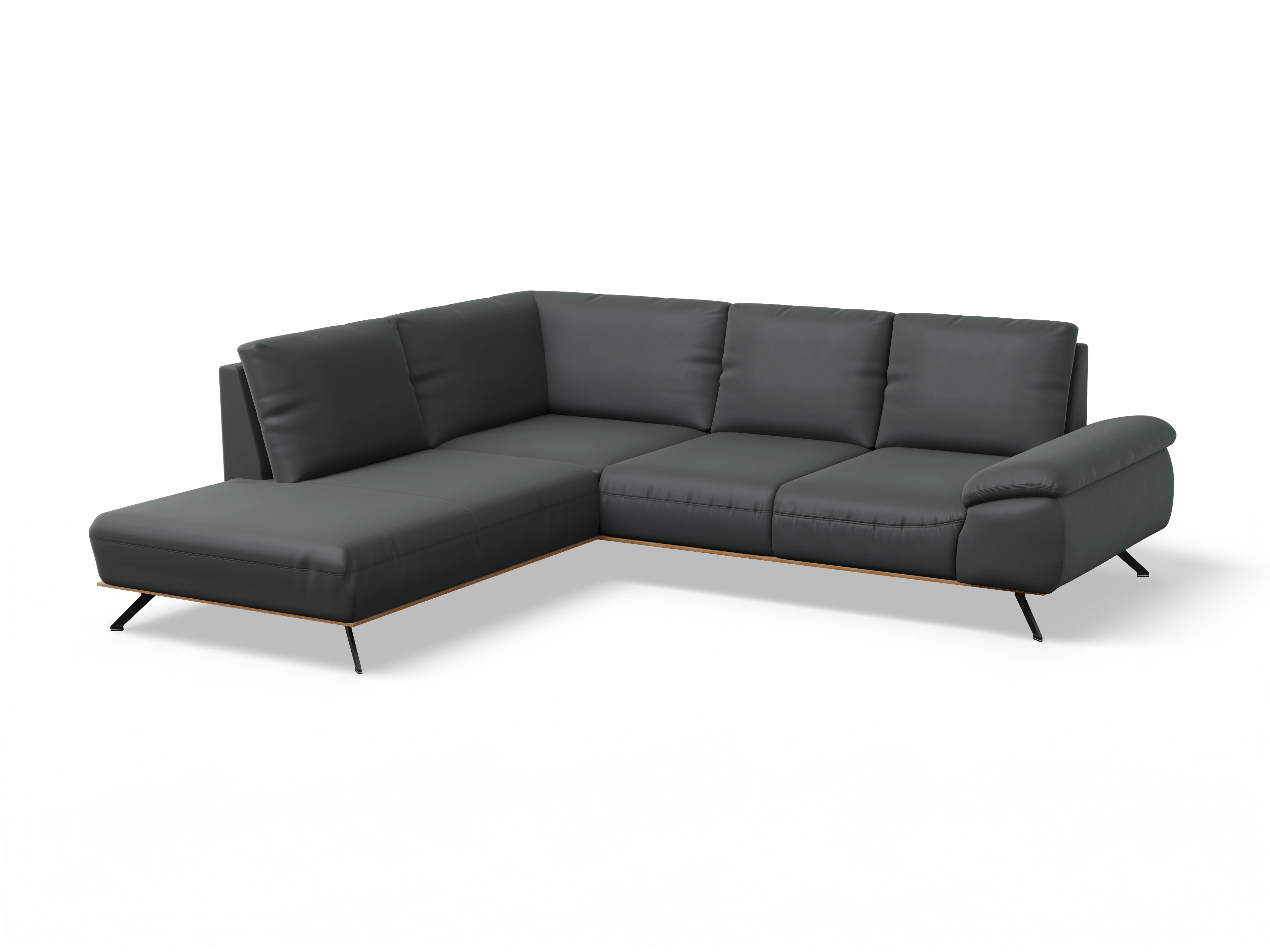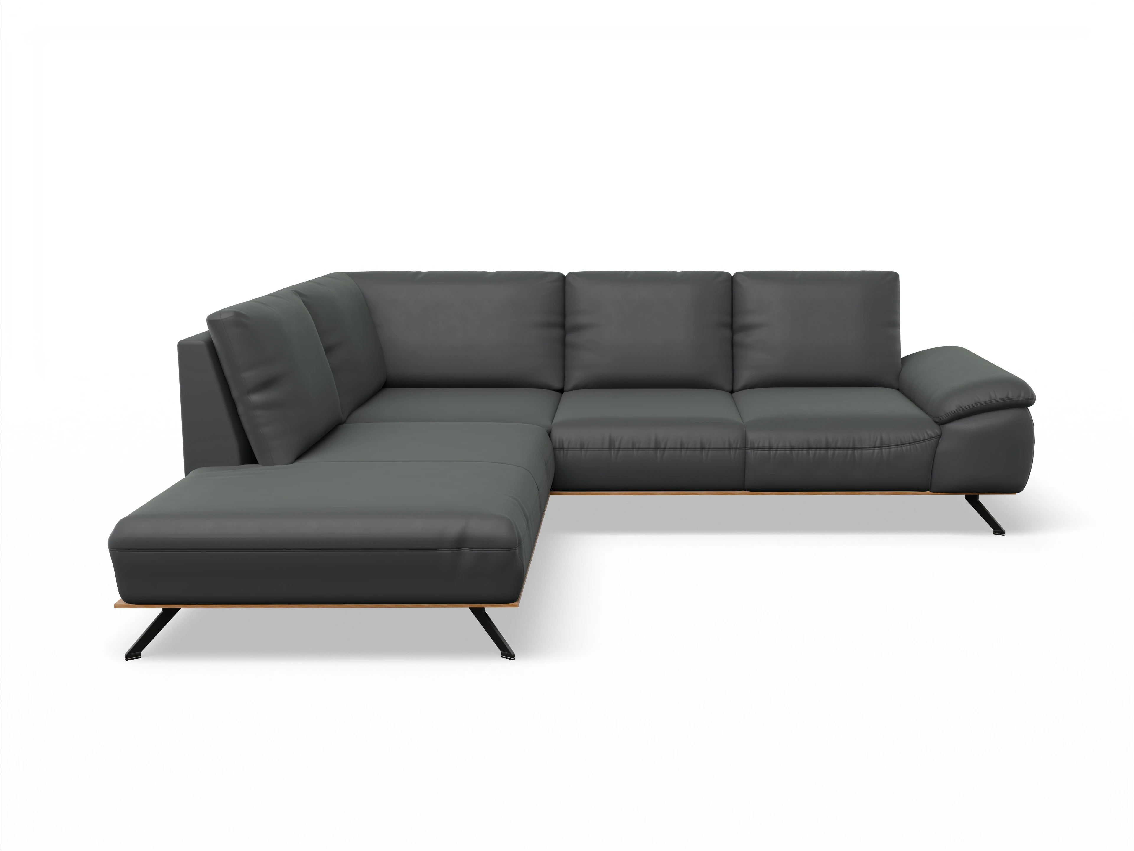 Das Ecksofa besteht aus einem 1,5-Sitzer mit Anstellhocker links, einer Spitzecke und einem 2,5-Sitzer mit Armlehne rechts.