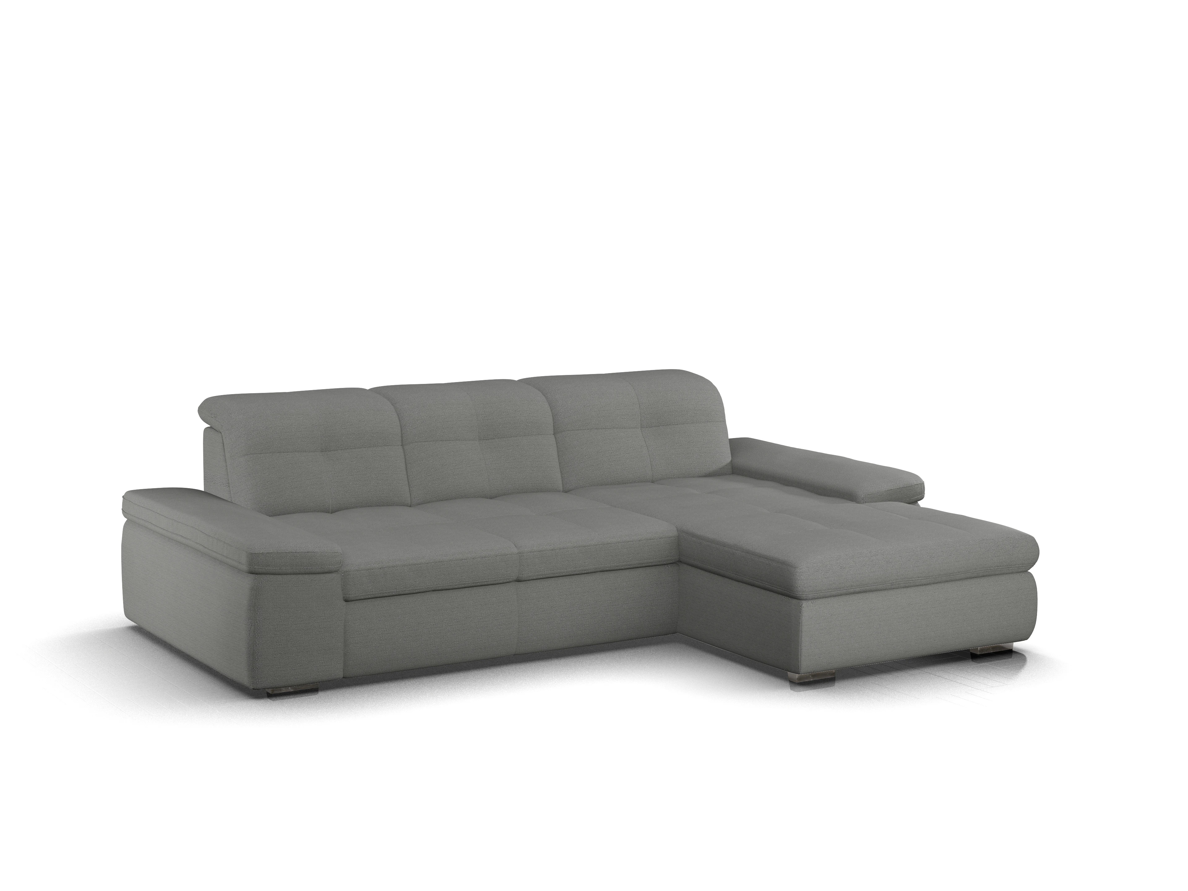 Das Ecksofa besteht aus einem 2,5-Sitzer mit einer Armlehne links, wahlweise mit Schlaffunktion und einem Canape mit einer Armlehne rechts, wahlweise mit Stauraum. Sowohl der 2,5-Sitzer, als auch der Canape sind inklusive Sitztiefenverstellung.