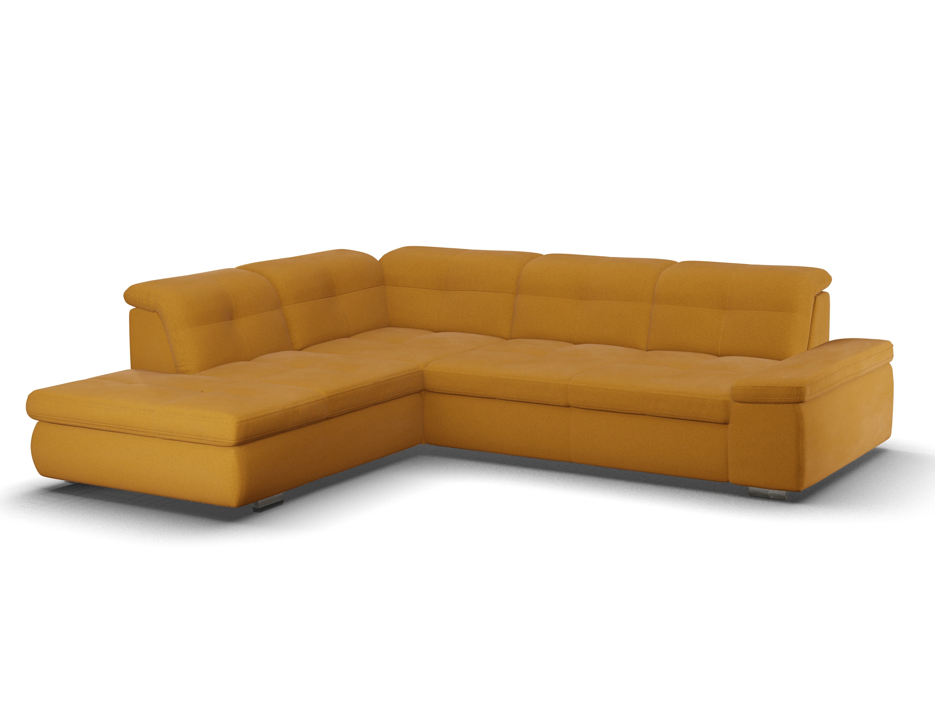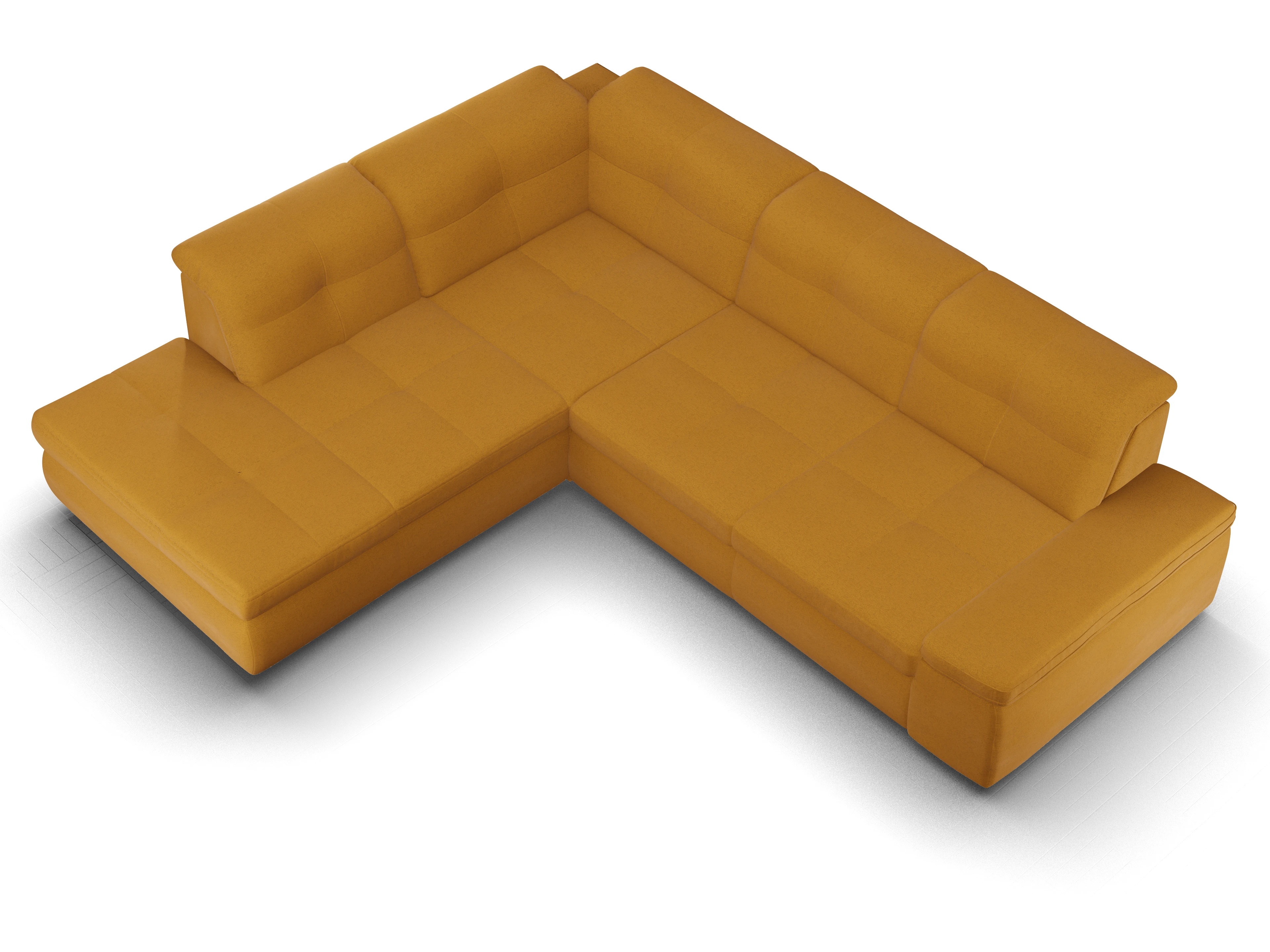 Das Ecksofa besteht aus einem 1,5-Sitzer mit Anstellhocker links, wahlweise mit Stauraum, einer Spitzecke und einem 3-Sitzer mit einer Armlehne rechts, wahlweise mit Schlaffunktion. Sowohl der 1,5-Sitzer mit Anstellhocker, als auch der 3-Sitzer sind inklusive Sitztiefenverstellung.