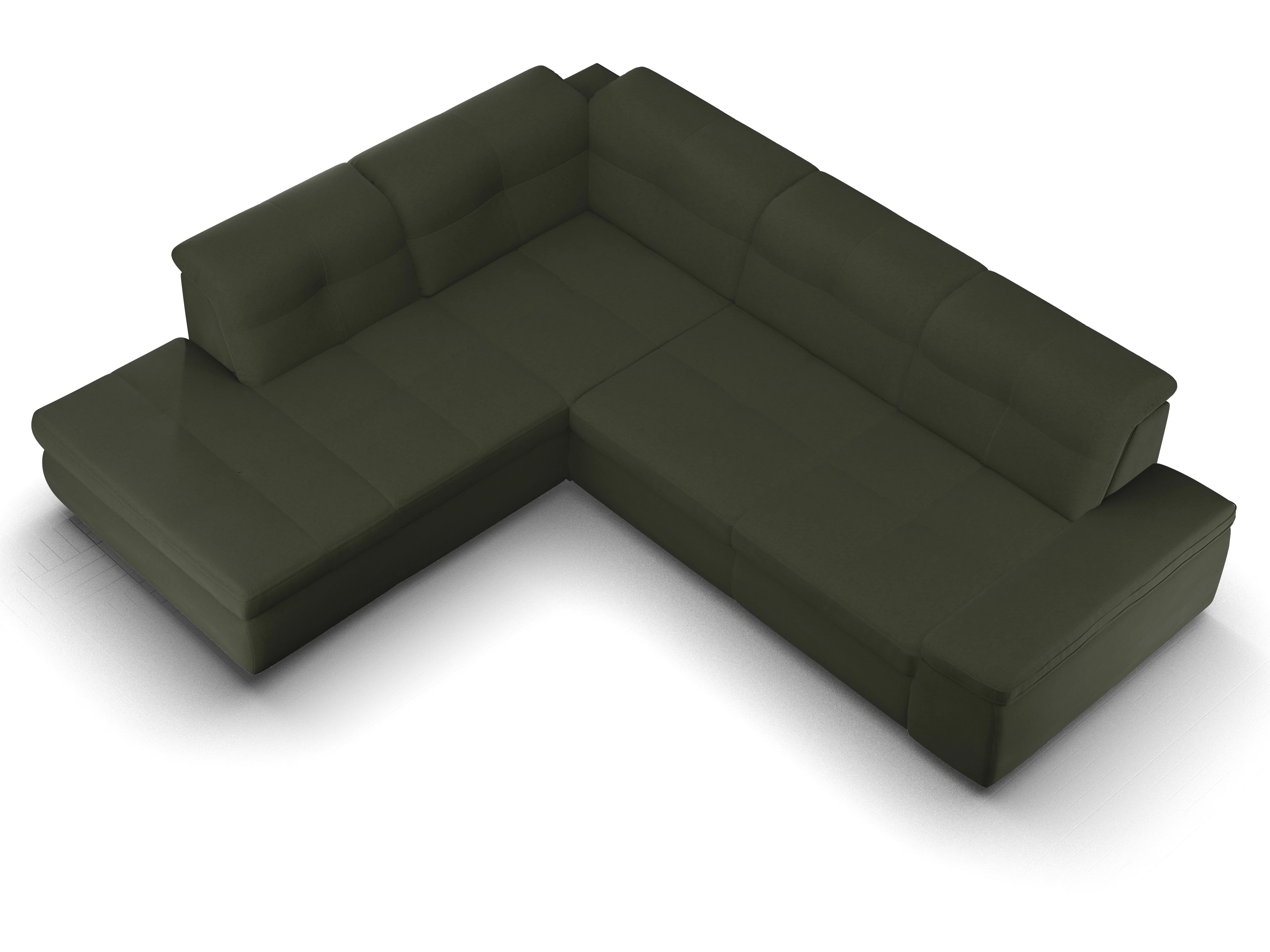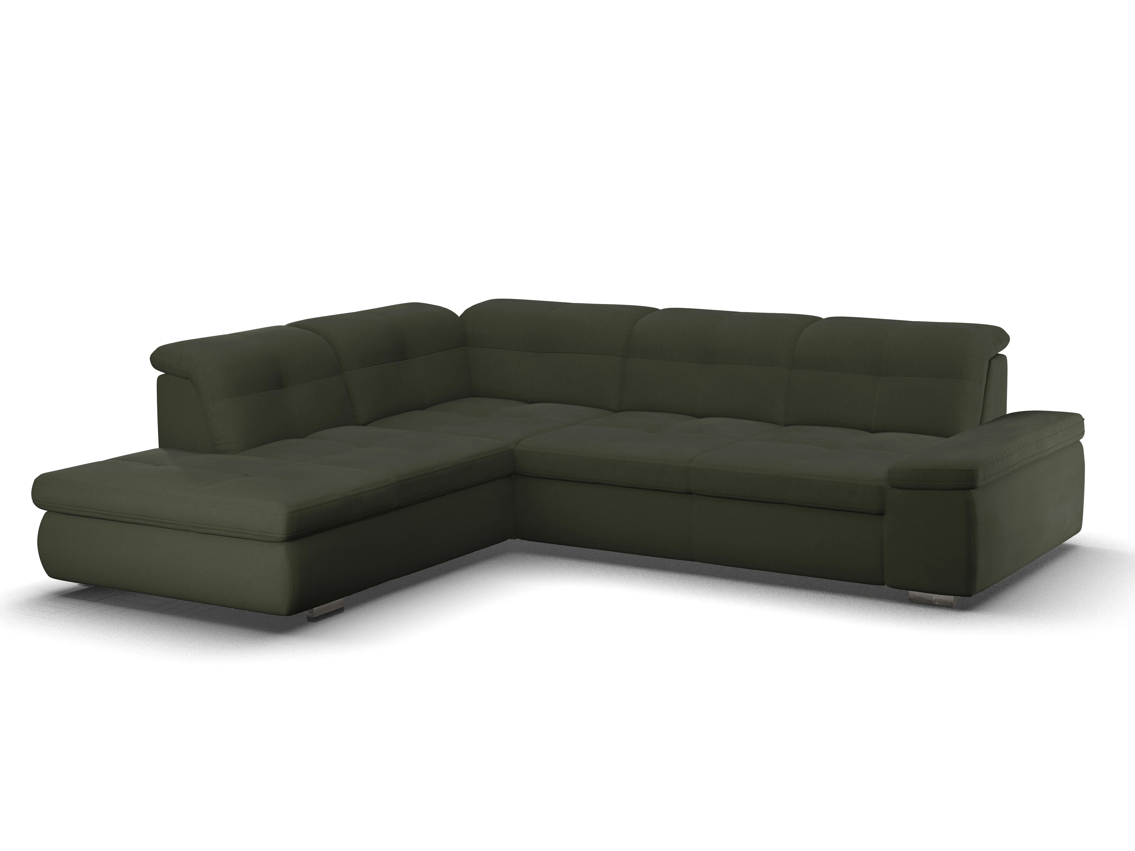 Das Ecksofa besteht aus einem 1,5-Sitzer mit Anstellhocker links, wahlweise mit Stauraum, einer Spitzecke und einem 3-Sitzer mit einer Armlehne rechts, wahlweise mit Schlaffunktion. Sowohl der 1,5-Sitzer mit Anstellhocker, als auch der 3-Sitzer sind inklusive Sitztiefenverstellung.