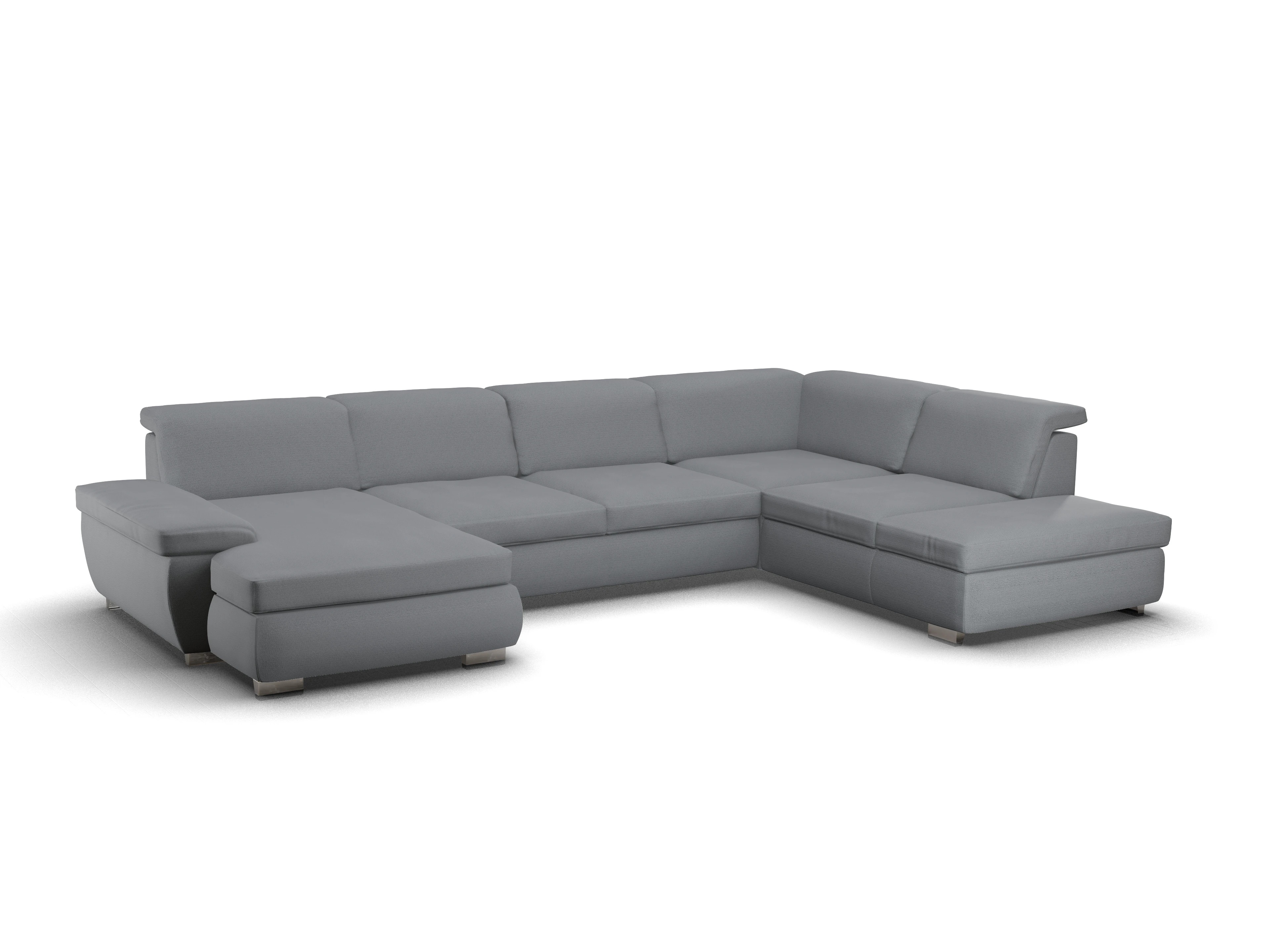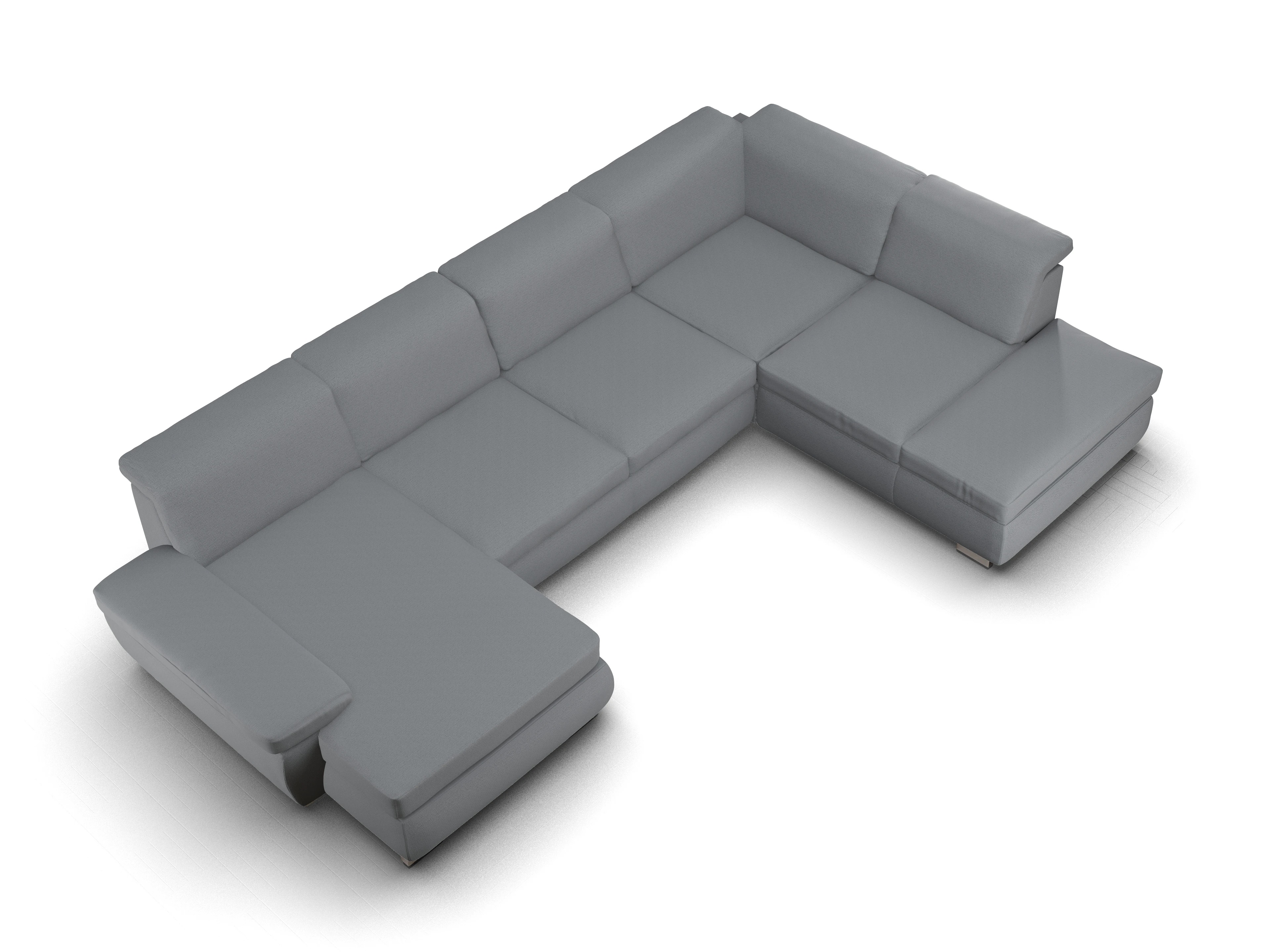 Die Wohnlandschaft besteht aus einem Canapé links, einem 3-Sitzer ohne Armlehne, einer Spitzecke sowie einem 1,5-Sitzer mit einem Anstellhocker rechts. Die Sitztiefenverstellung ist beim Canapé, 3-Sitzer und beim 1,5-Sitzer inklusive (4x).