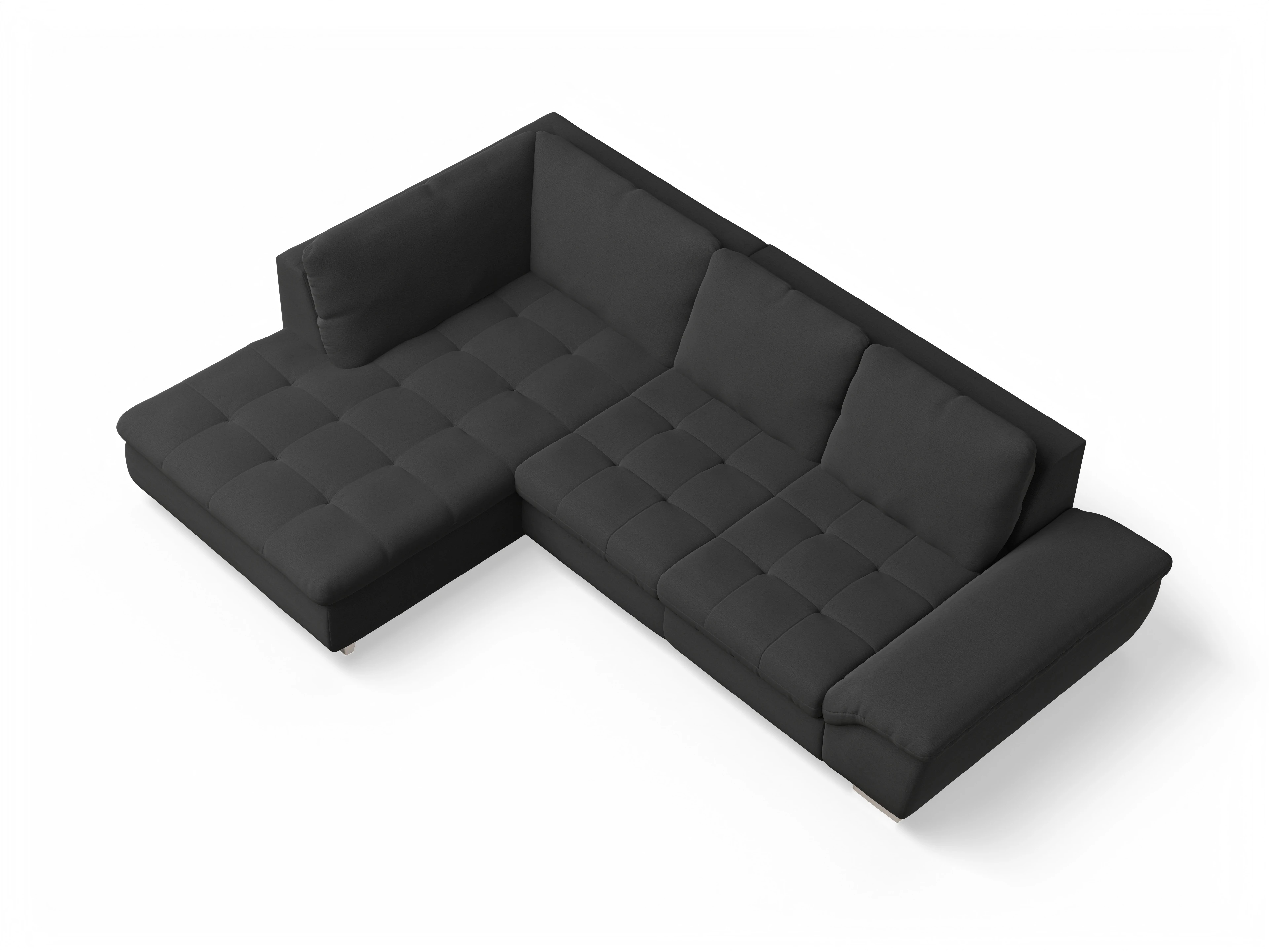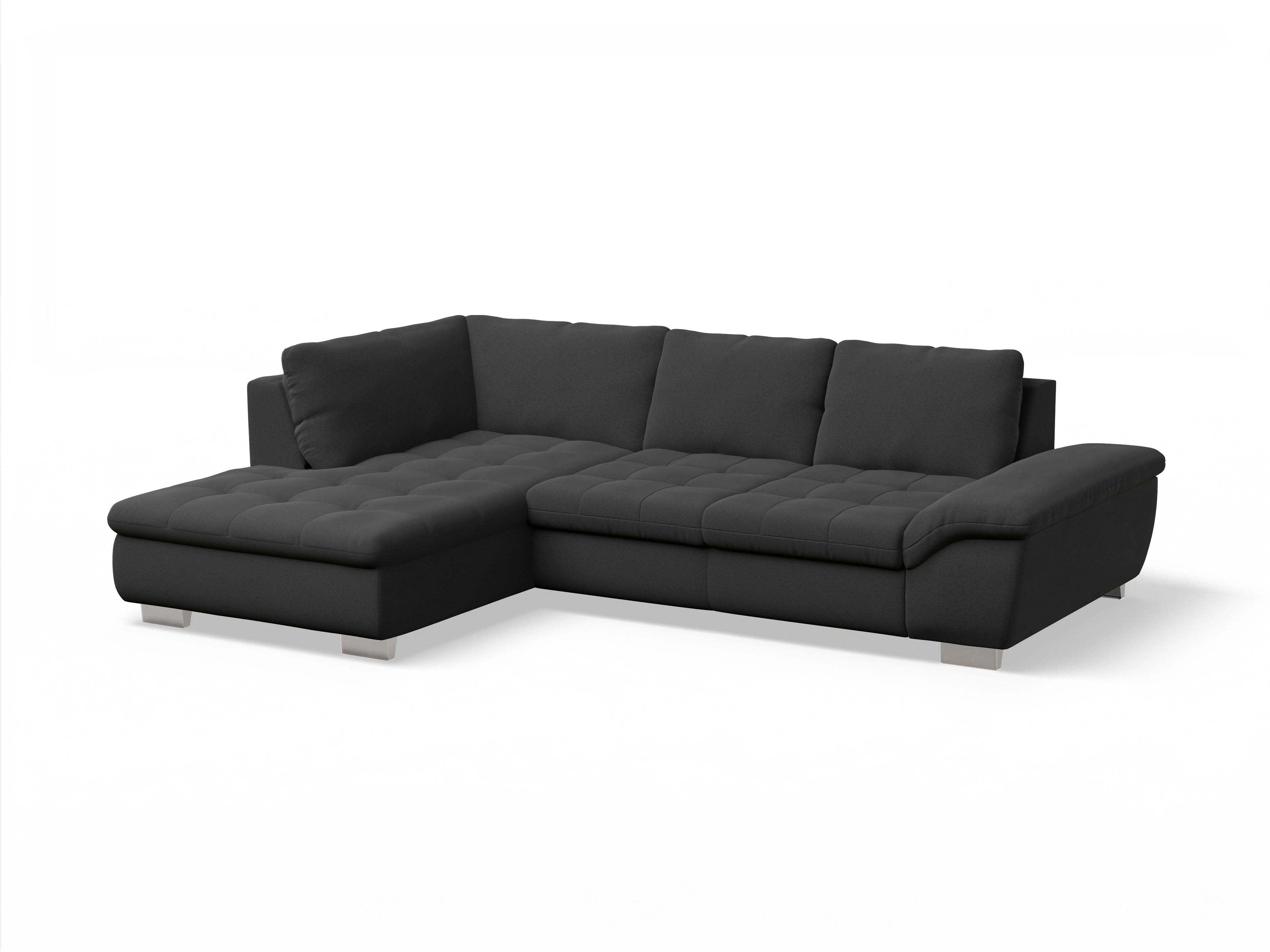 Das Ecksofa besteht aus einem Kombielement links, wahlweise mit Schubkasten und Anstellhocker und einem 2,5-Sitzer mit einer Armlehne rechts, wahlweise mit Schlaffunktion. Die Sitztiefenverstellung kann nur bei dem 2,5-Sitzer dazubestellt werden.