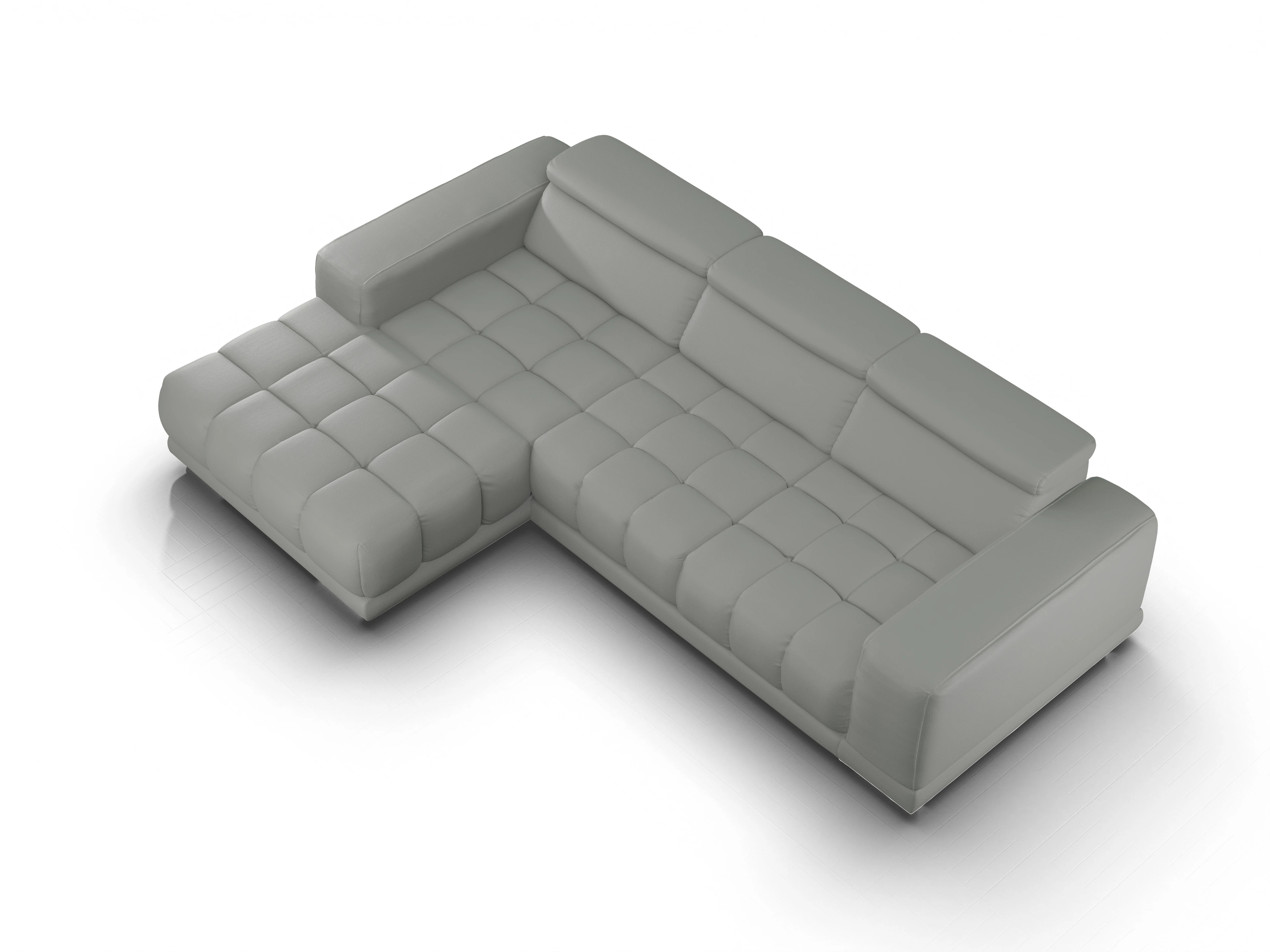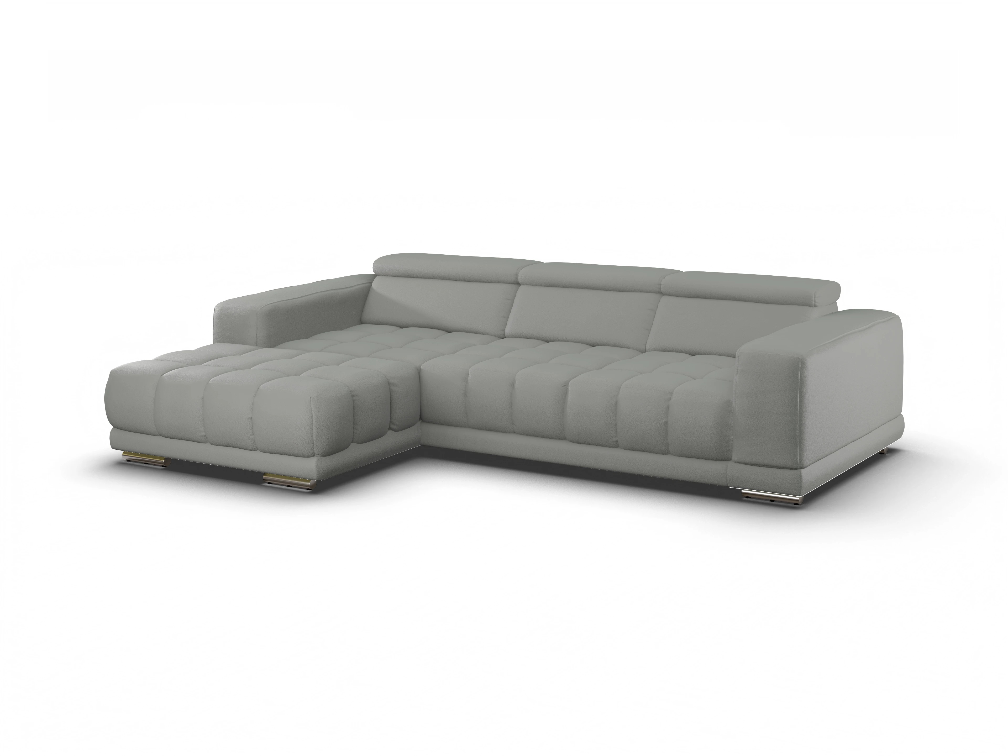 Das Ecksofa besteht aus einem Canapé mit einer Armlehne links und einem 2,5-Sitzer mit einer Armlehne rechts, wahlweise mit Vorziehfunktion. Sowohl der 2,5-Sitzer, als auch der Canape kommen mit einer Kopfteilverstellung.