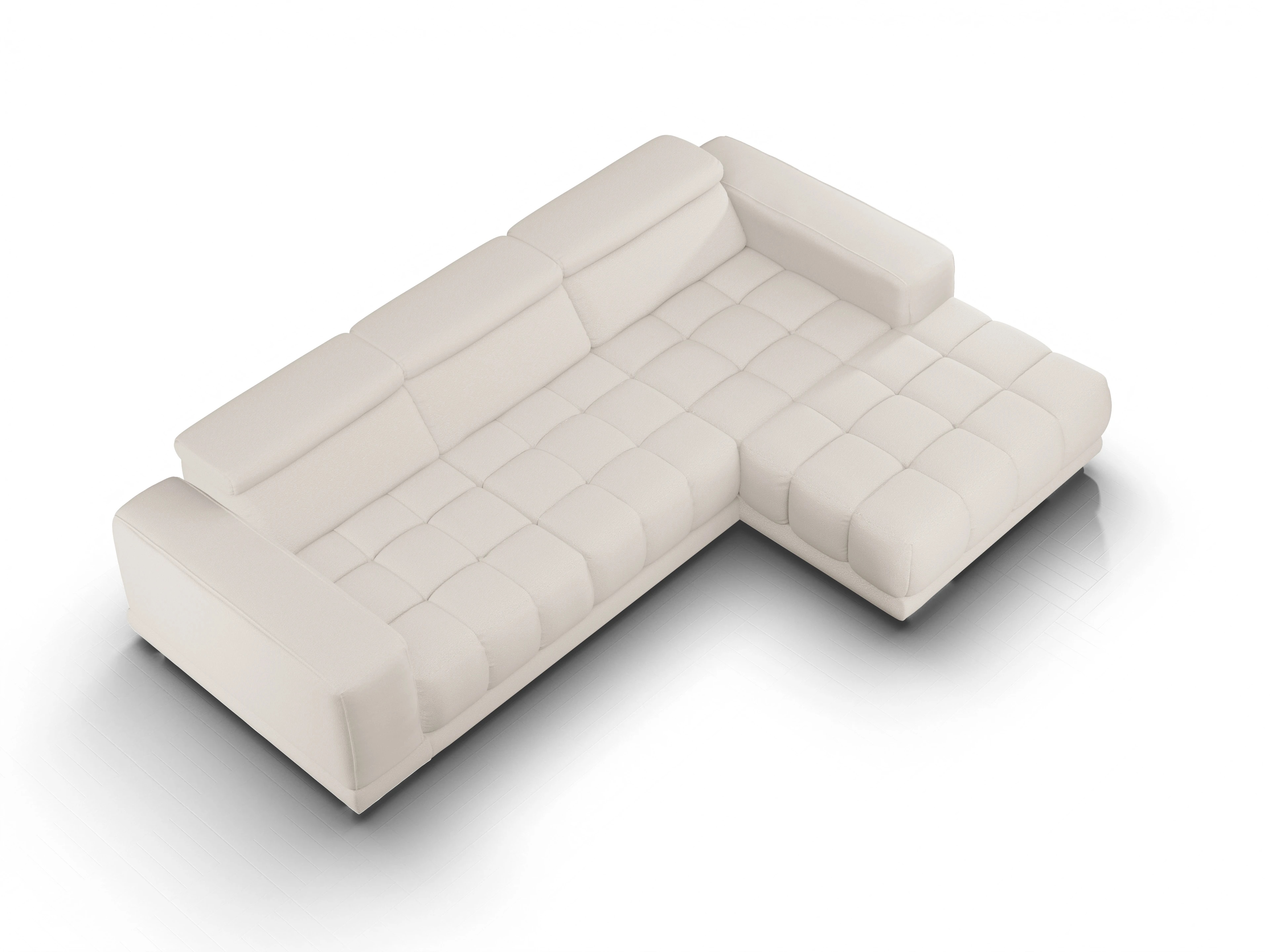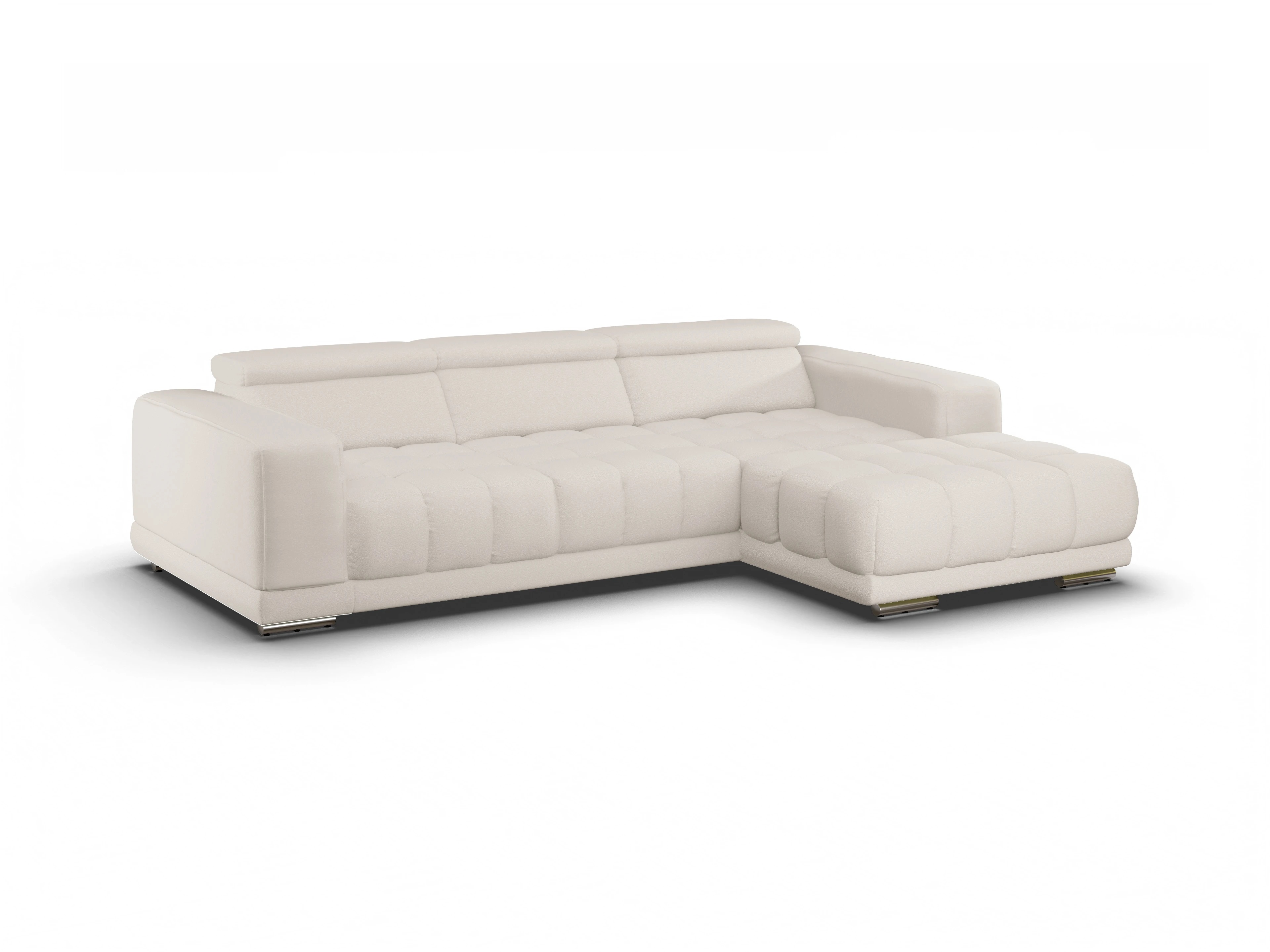 Das Ecksofa besteht aus einem 2,5-Sitzer mit einer Armlehne links, wahlweise mit Vorziehfunktion und einem Canape mit einer Armlehne rechts. Sowohl der 2,5-Sitzer, als auch der Canape kommen mit einer Kopfteilverstellung.