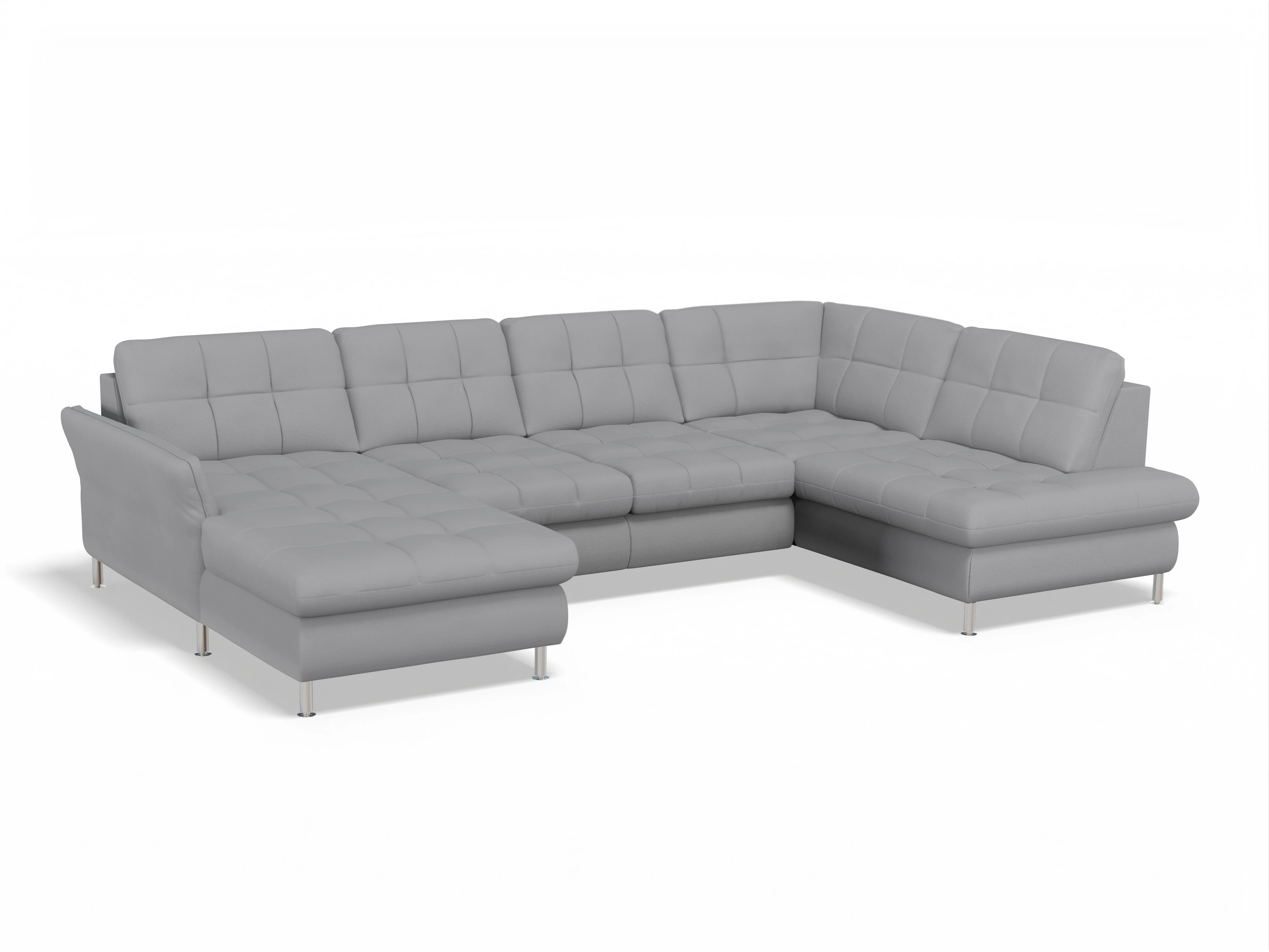 Die Wohnlandschaft besteht aus einem Canape mit Armlehne links, wahlweise mit Stauraum, einem 2,5-Sitzer mittig, wahlweise mit einer Schlaffunktion und einem 1-Sitzer Kombielement, wahlweise mit Bettkasten. Der 2,5-Sitzer kommt mit einer Sitztiefenverstellung inklusive (2x), beim Canapé gegen Aufpreis möglich.