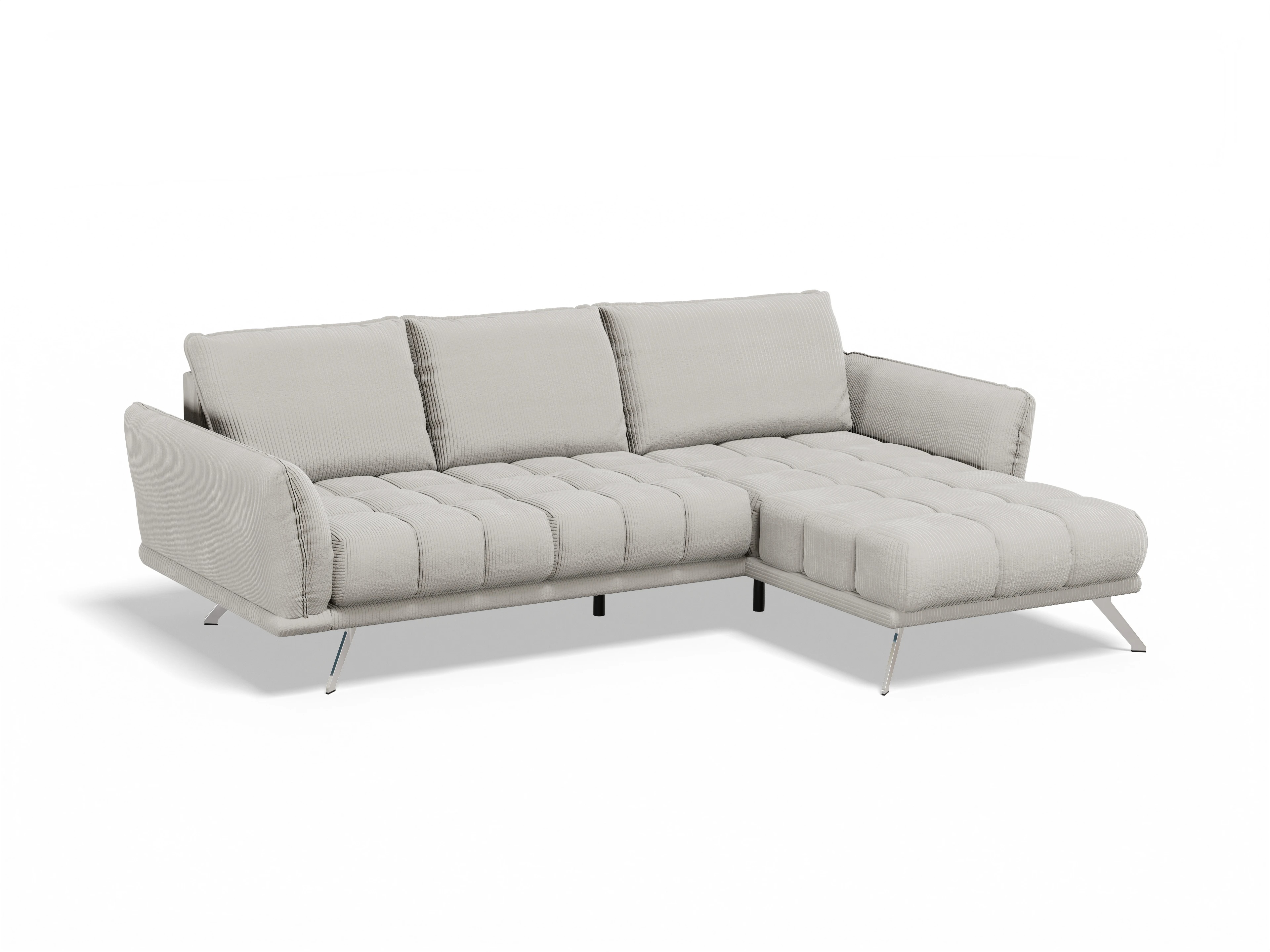 Das Ecksofa besteht aus einem 2,5-Sitzer mit einer Armlehne links und einem Canapé mit einer Armlehne rechts.