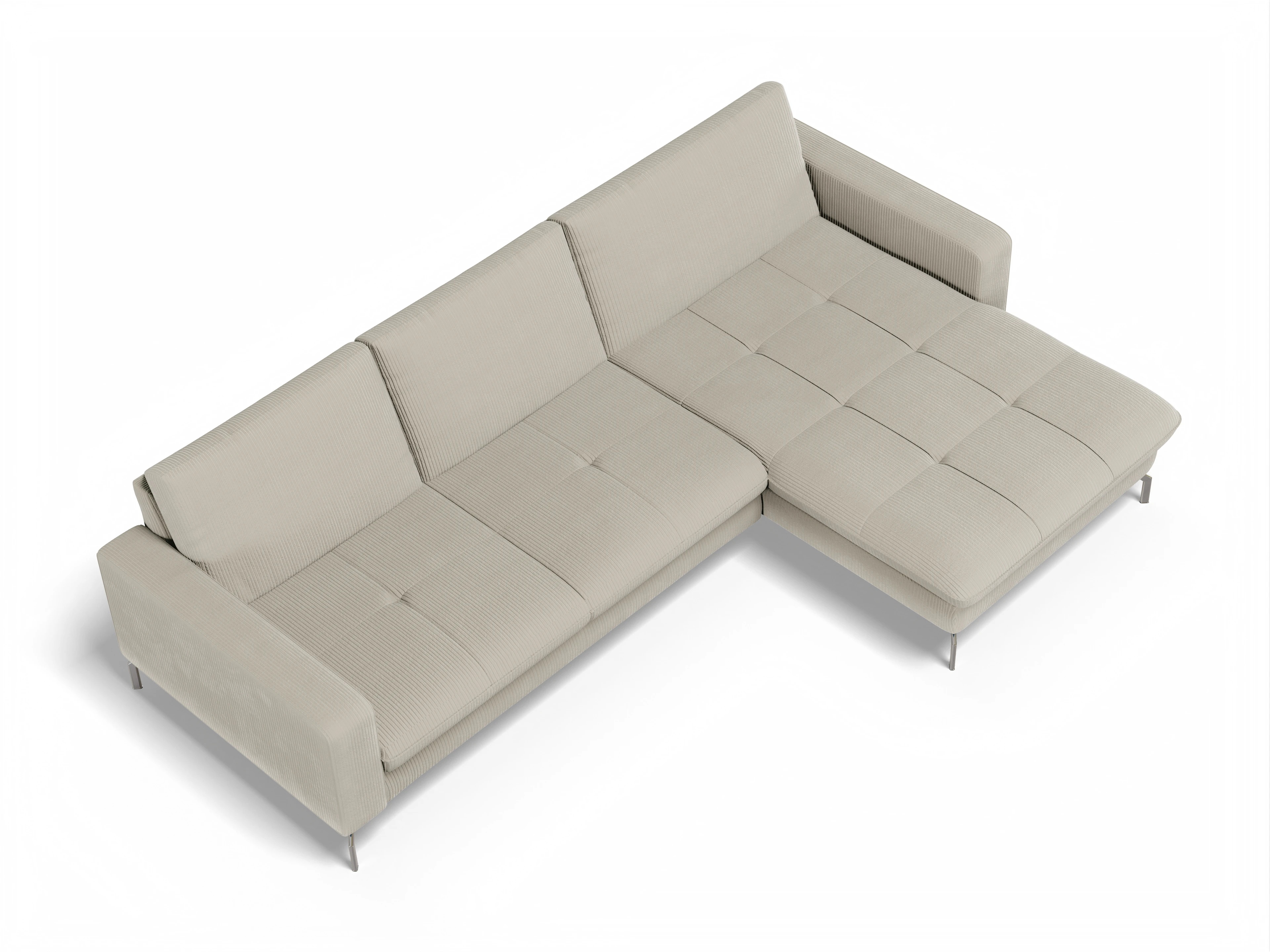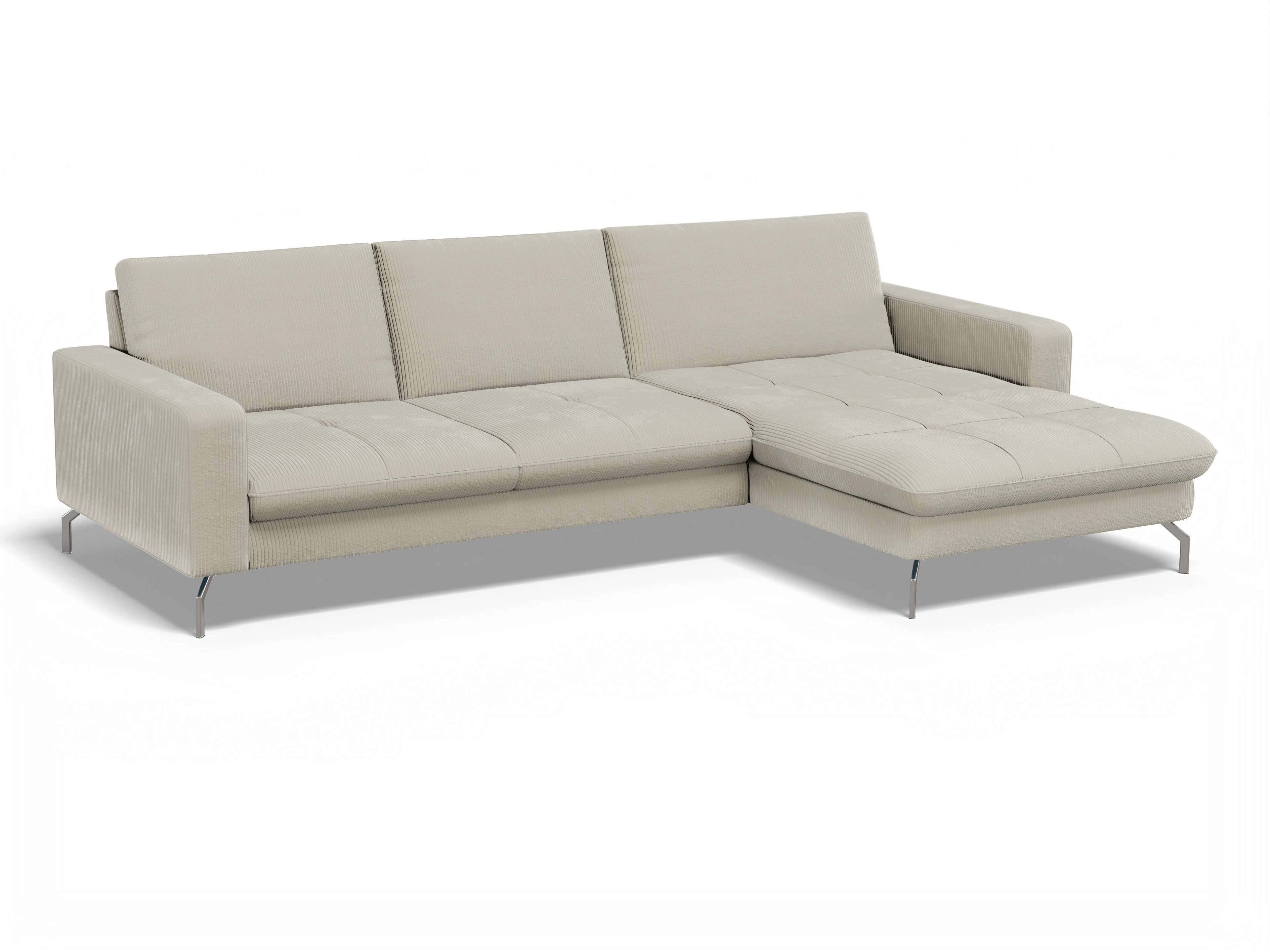 Das Ecksofa besteht aus einem 3-Sitzer mit einer Armlehne links und einem Canapé XL mit einer Armlehne rechts.