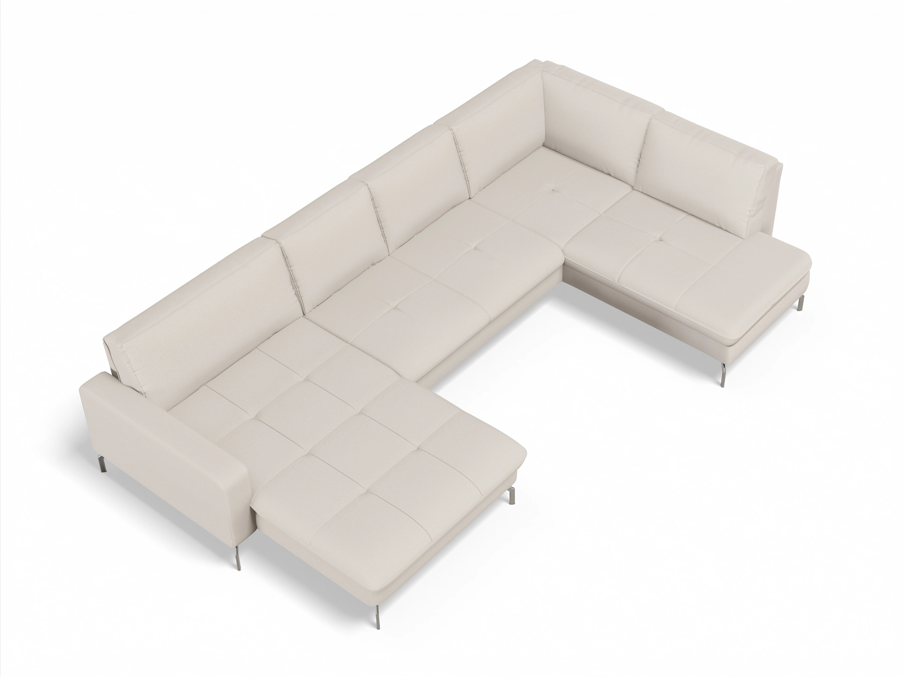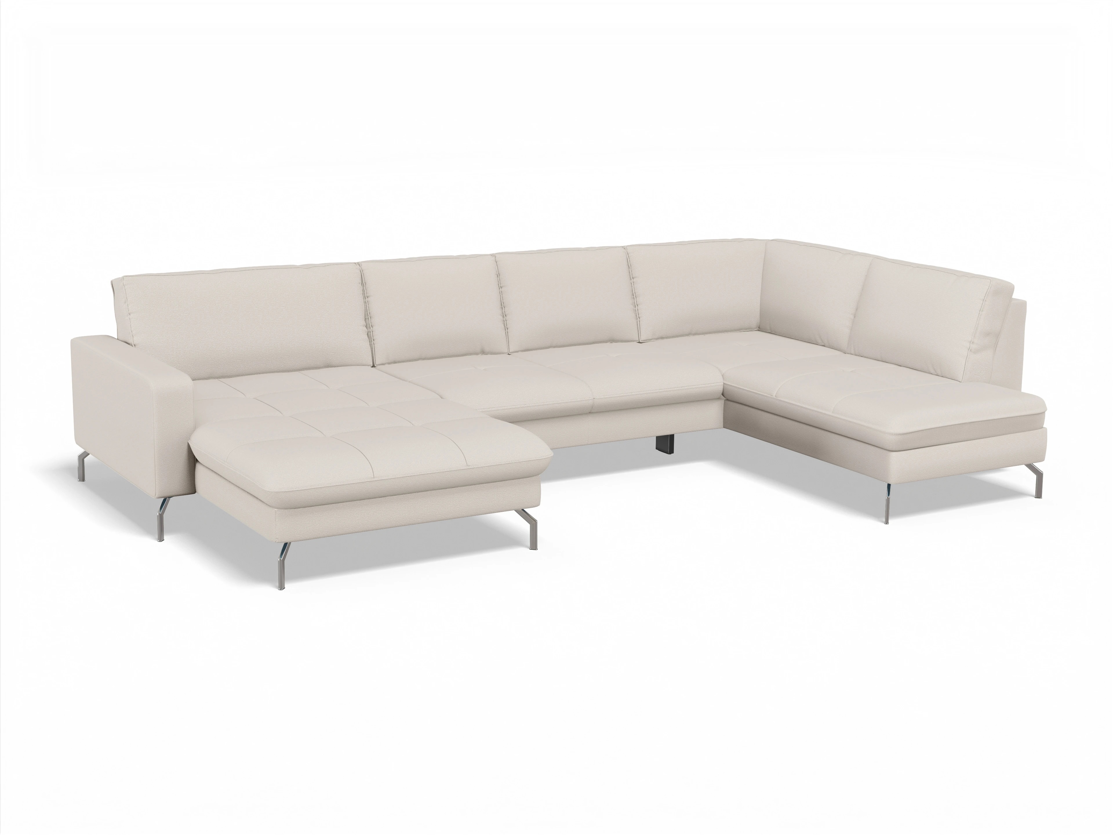 Die Wohnlandschaft besteht aus einem Canapé XL mit Armlehne links, einem 2,5-Sitzer mittig, wahlweise mit einer Schlaffunktion, einer Spitzecke und einem 1,5-Sitzer mit Anstellhocker.