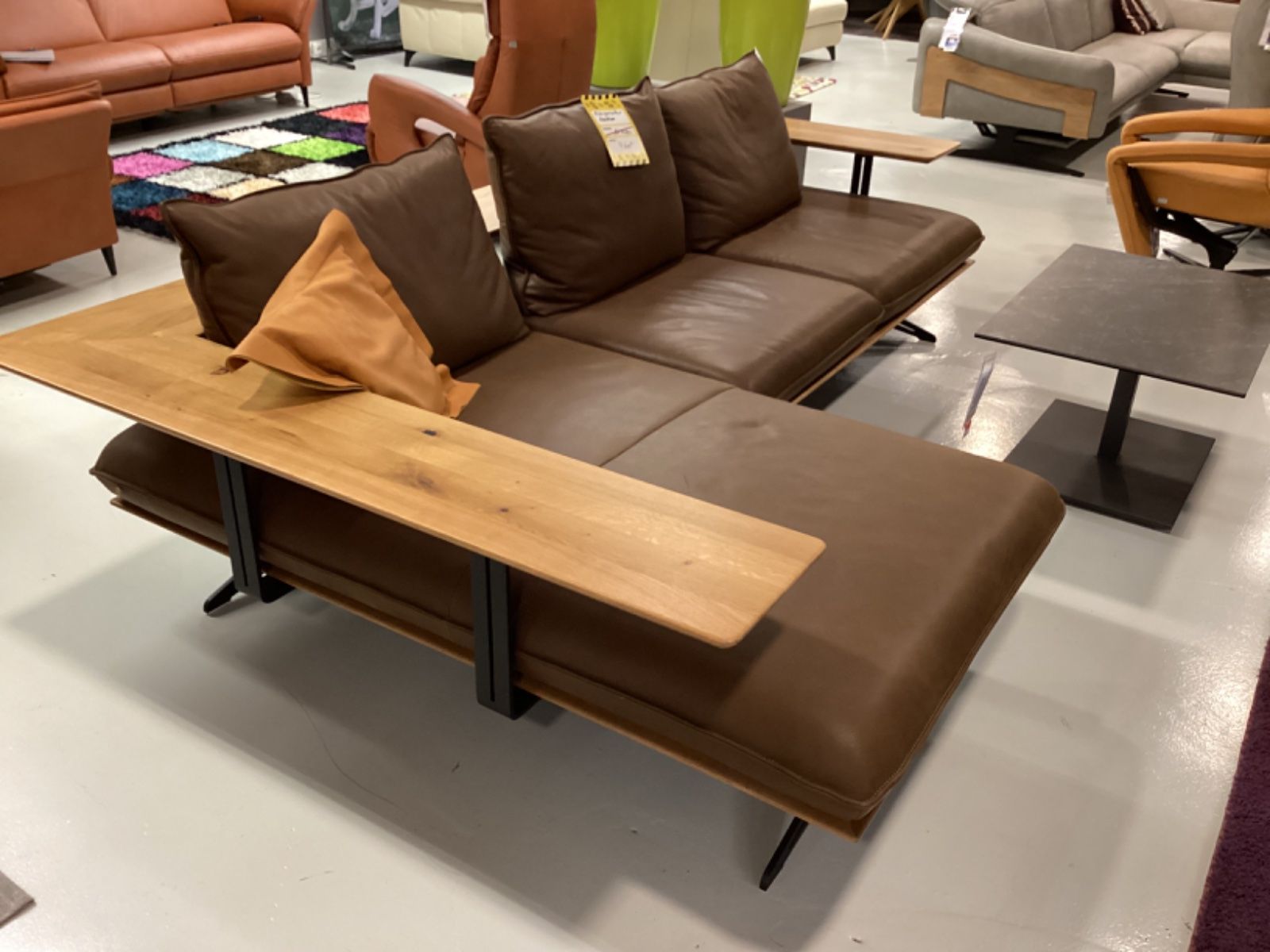 ℹ️ Besondere Details: Geniales Ecksofa, Leder A-India Muskat, Füße Metallkufe Schwarz matt, Sitzhöhe 45 cm, inkl. Motorische Sitztiefenverstellung im 2,5 Sitzer. Massivholzreling Wildeiche Natur.