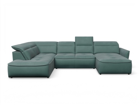 Das Ecksofa besteht aus einer Umbauecke links inkl. Bettkasten und einem 2-Sitzer mit Armlehne rechts inkl. motorischer Sitztiefenverstellung. Das Ecksofa wird mit 5 verstellbaren Kopfstützen geliefert.