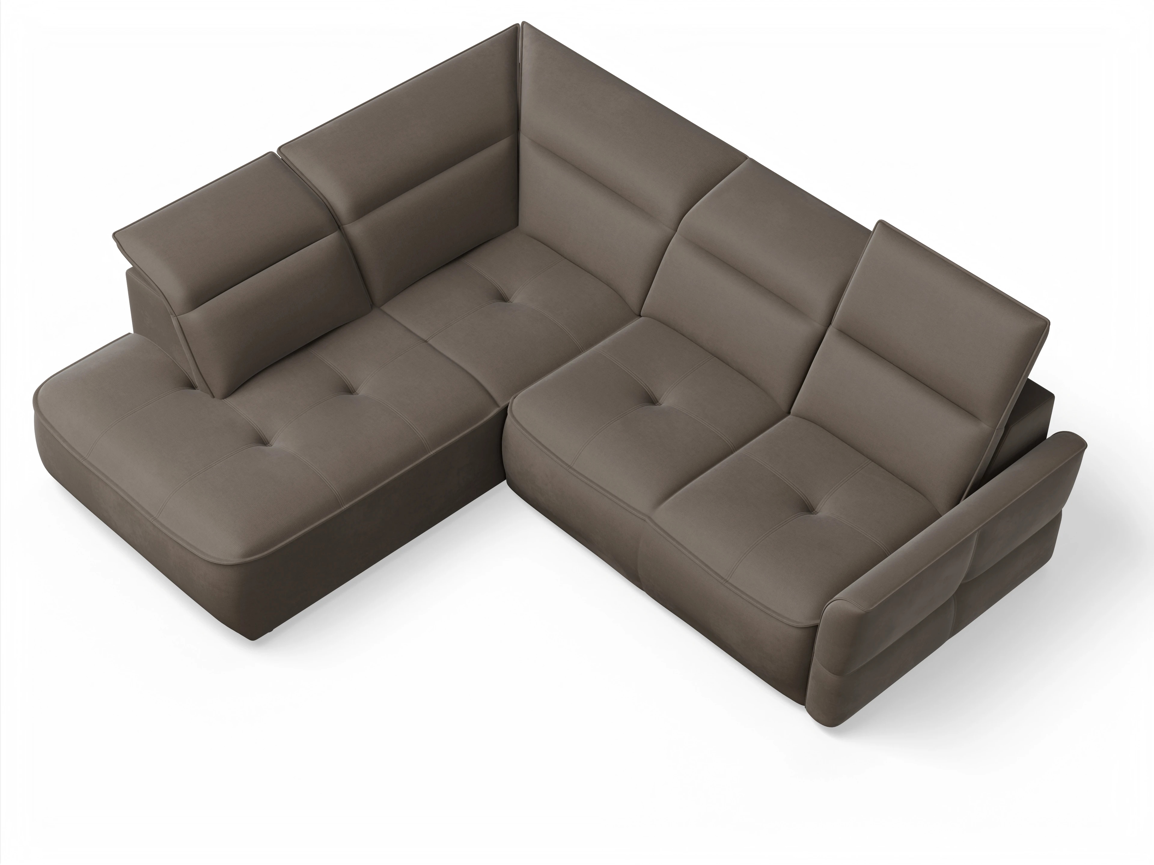 Das Ecksofa besteht aus einer Umbauecke links inkl. Bettkasten und einem 2-Sitzer mit Armlehne rechts inkl. motorischer Sitztiefenverstellung. Das Ecksofa wird mit 5 verstellbaren Kopfstützen geliefert.