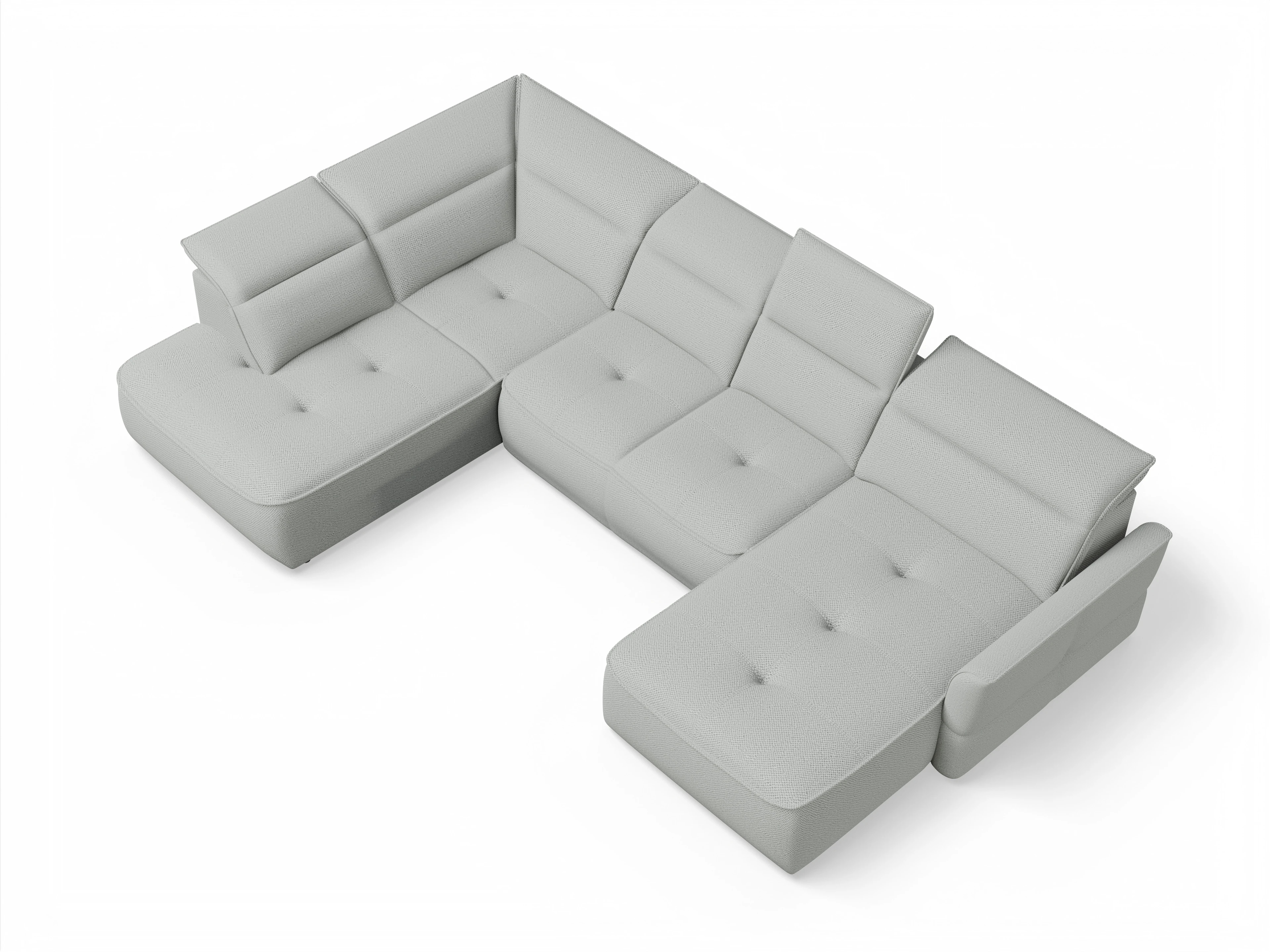 Die Wohnlandschaft besteht aus einer Eckottomane links inkl. Bettkasten, einem 2-Sitzer ohne Armlehne inkl. motorischer Sitztiefenverstellung und einer Ottomane mit Armlehne rechts. Die Wohnlandschaft wird mit 6 verstellbaren Kopfstützen geliefert.