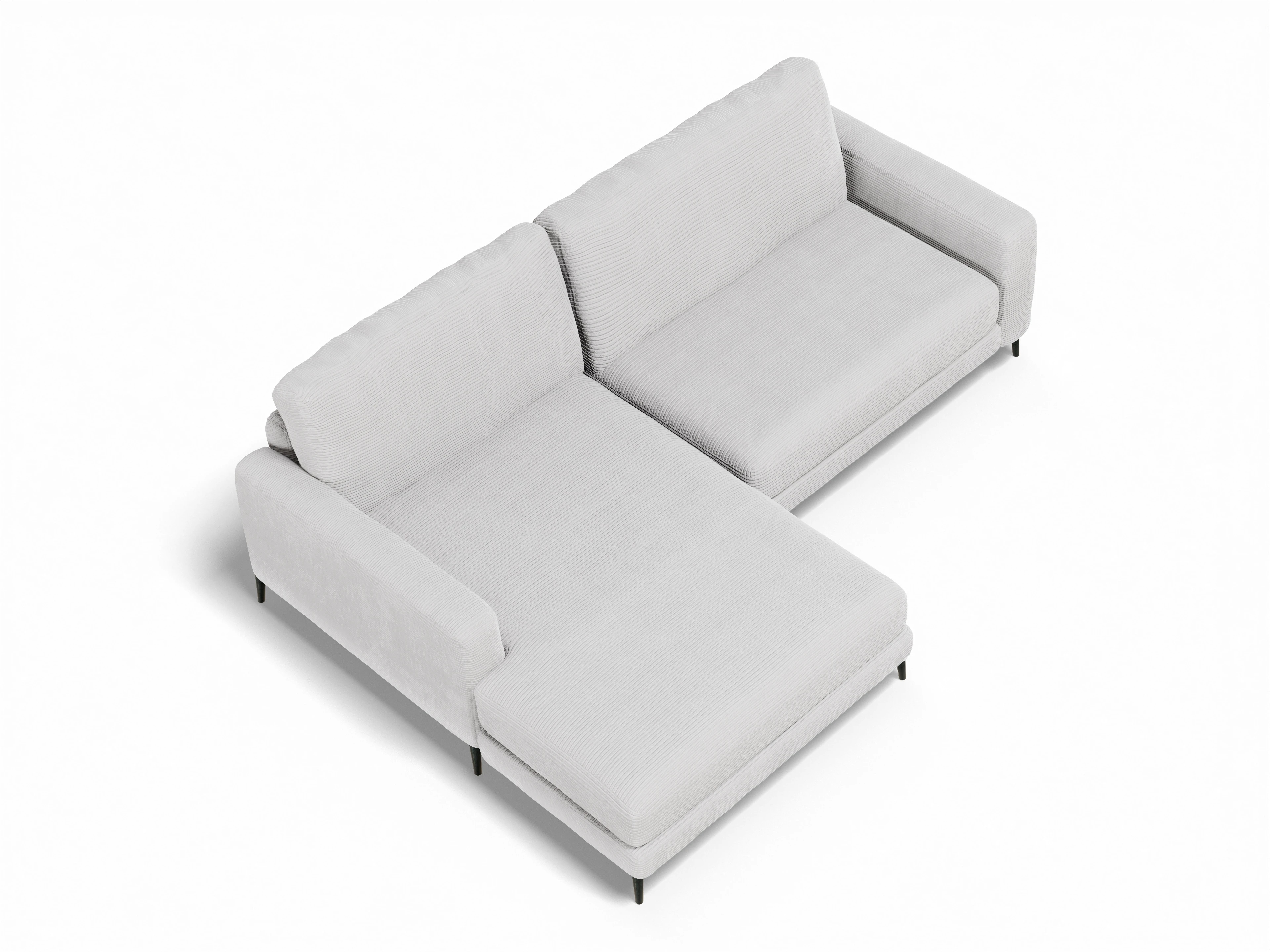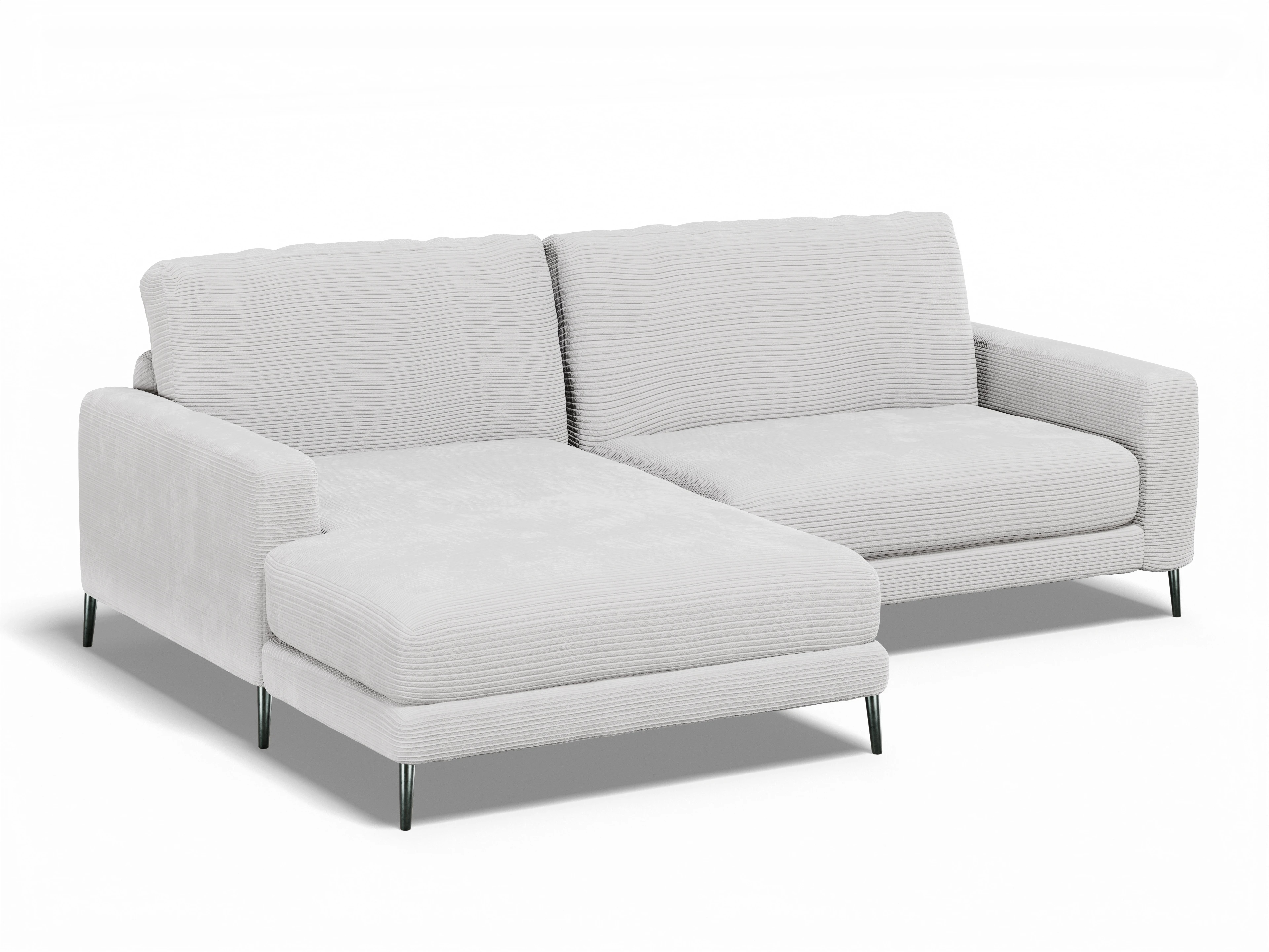 Das Ecksofa besteht aus einem Longchair mit Armlehne links und einem 1,5 -Sitzer mit Armlehne rechts.