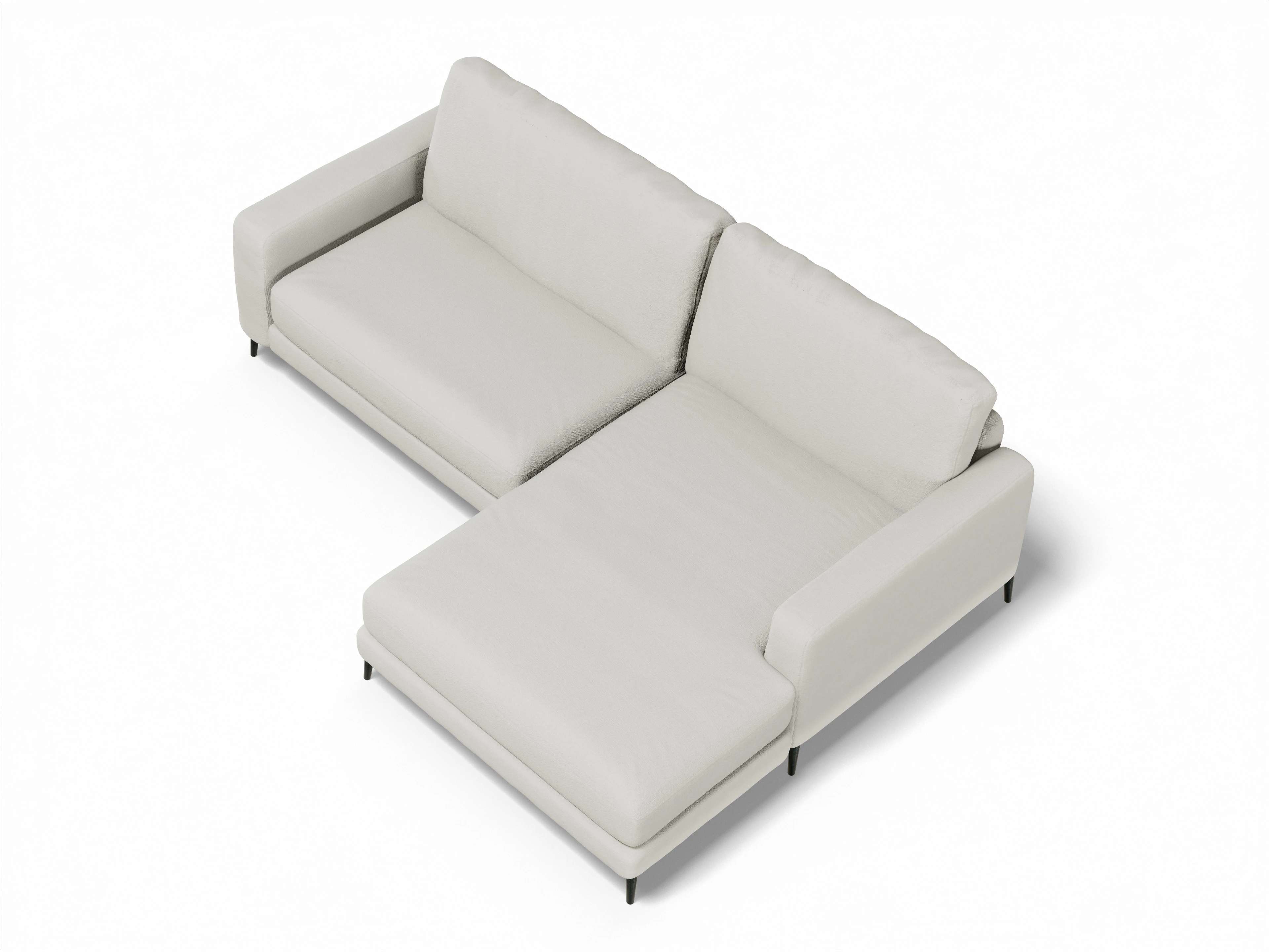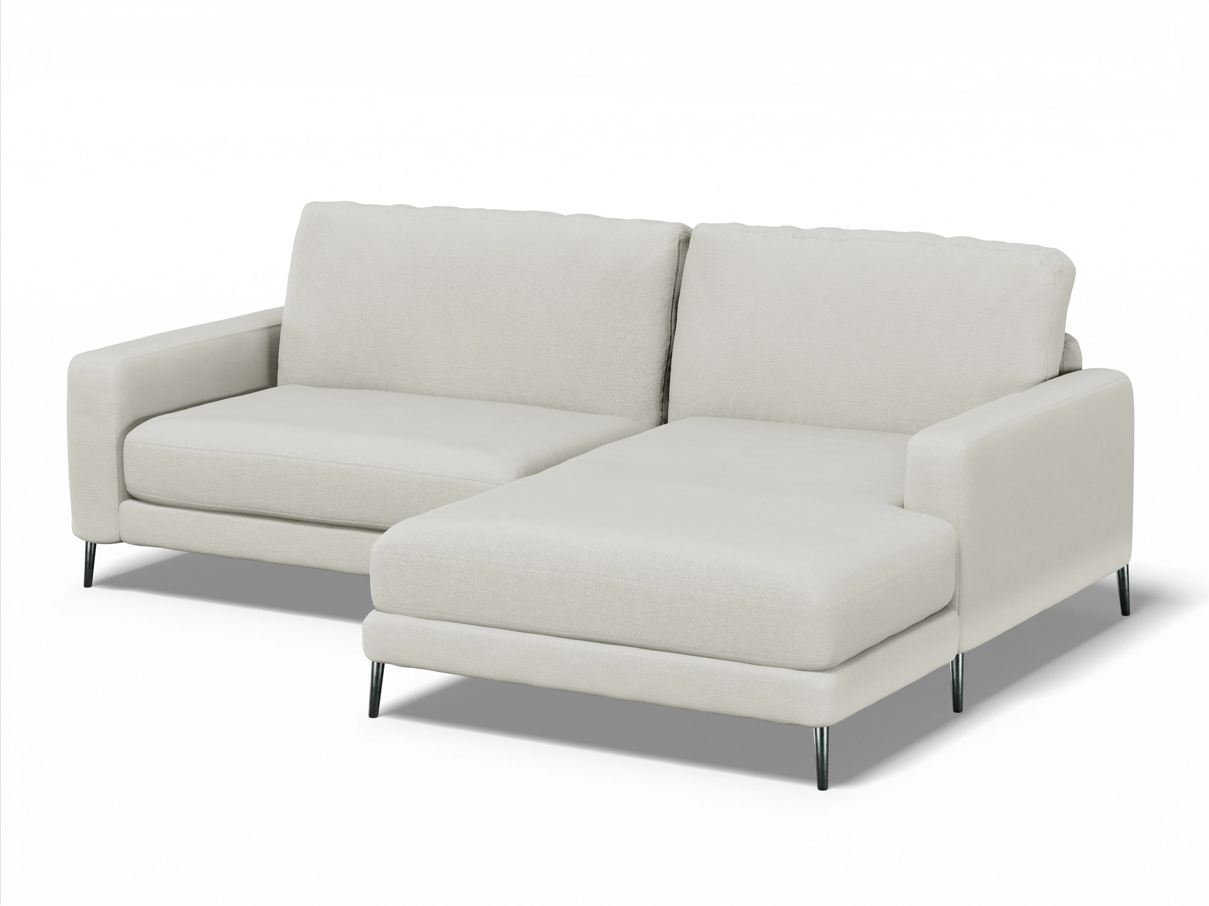 Das Ecksofa besteht aus einem 1,5 -Sitzer mit Armlehne links und einem Longchair mit Armlehne rechts.