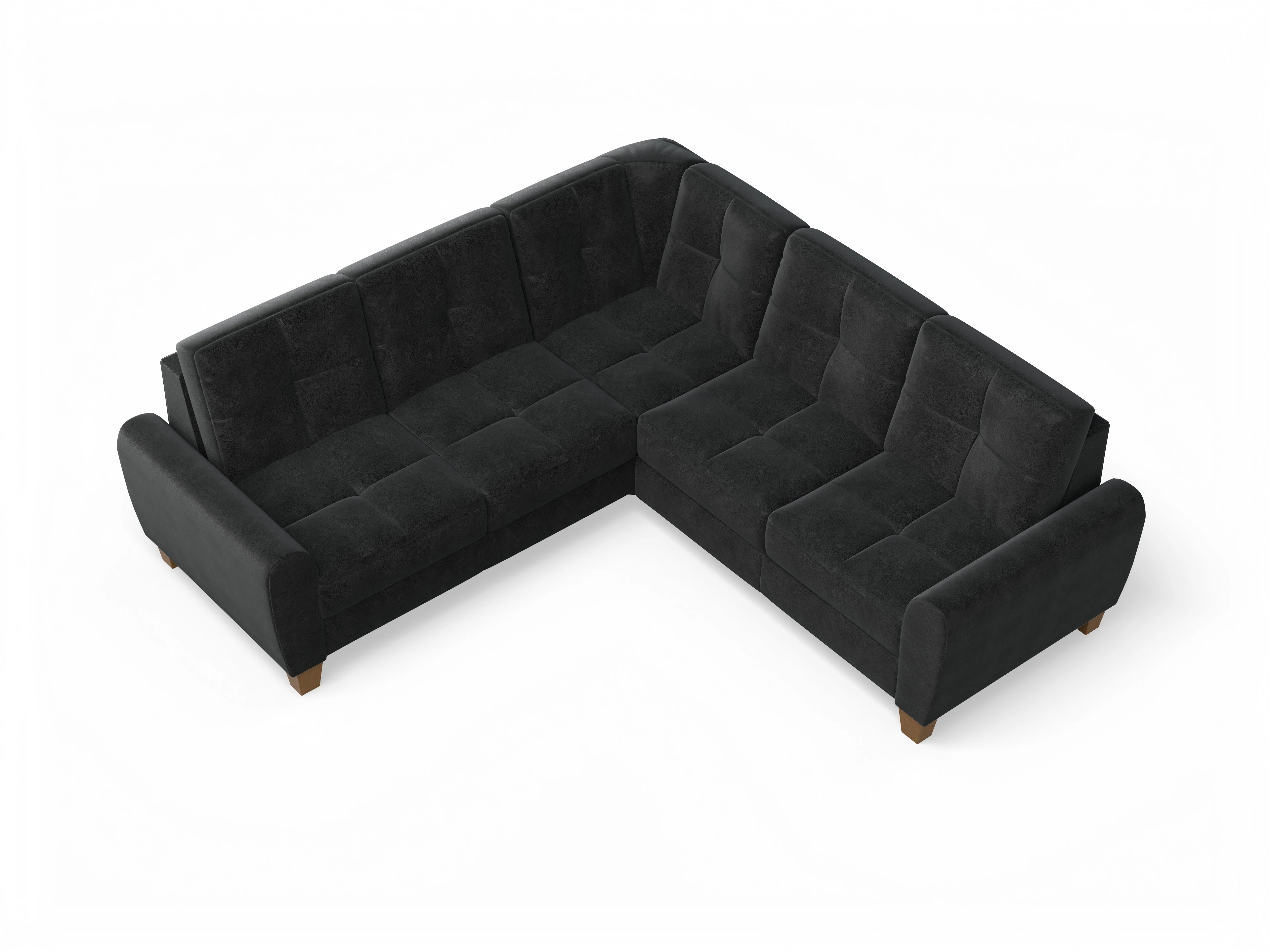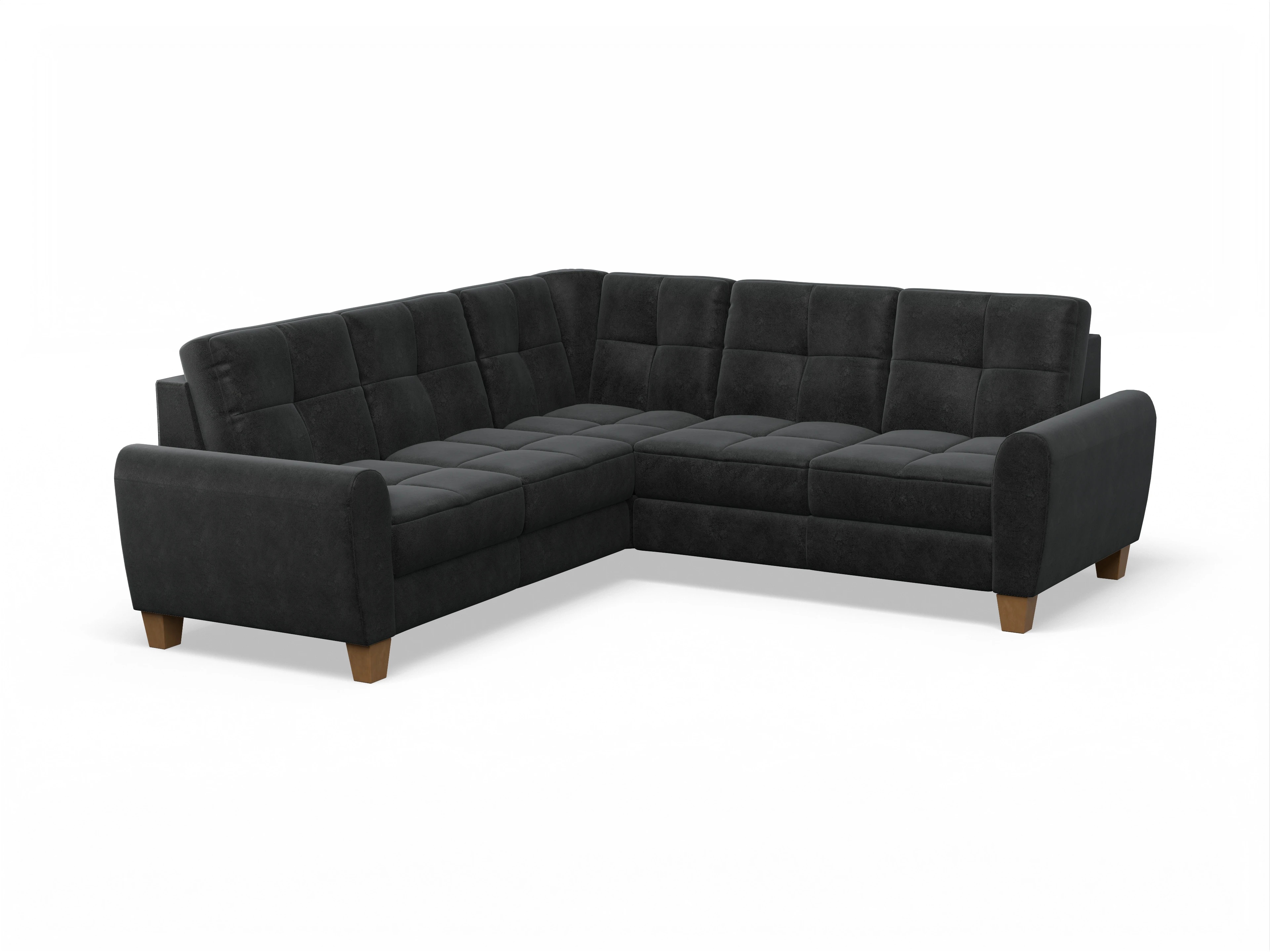 Das Ecksofa besteht aus einem 2-Sitzer mit einer Armlehne links, einer Spitzecke und einem 2-Sitzer mit einer Armlehne rechts.