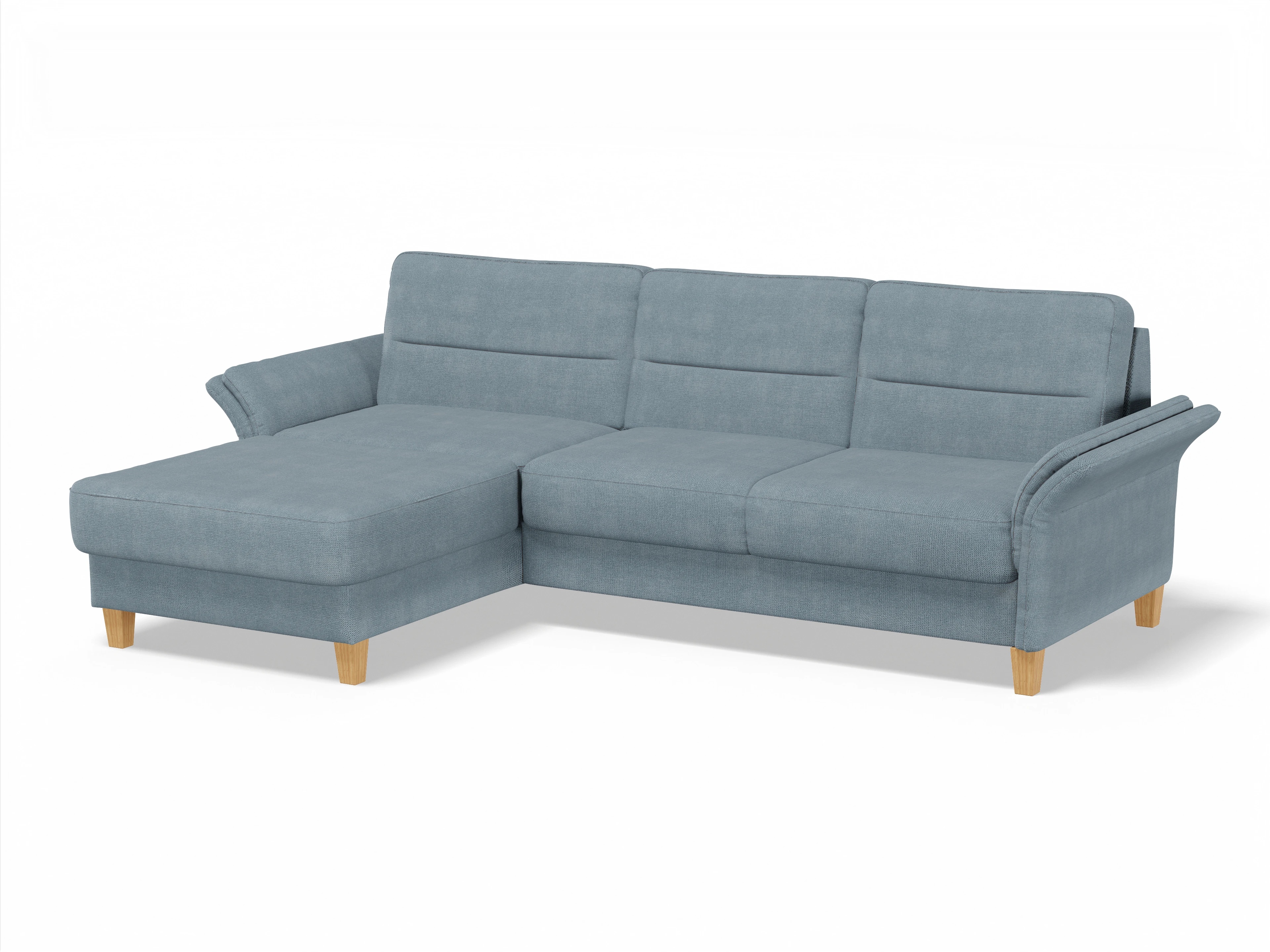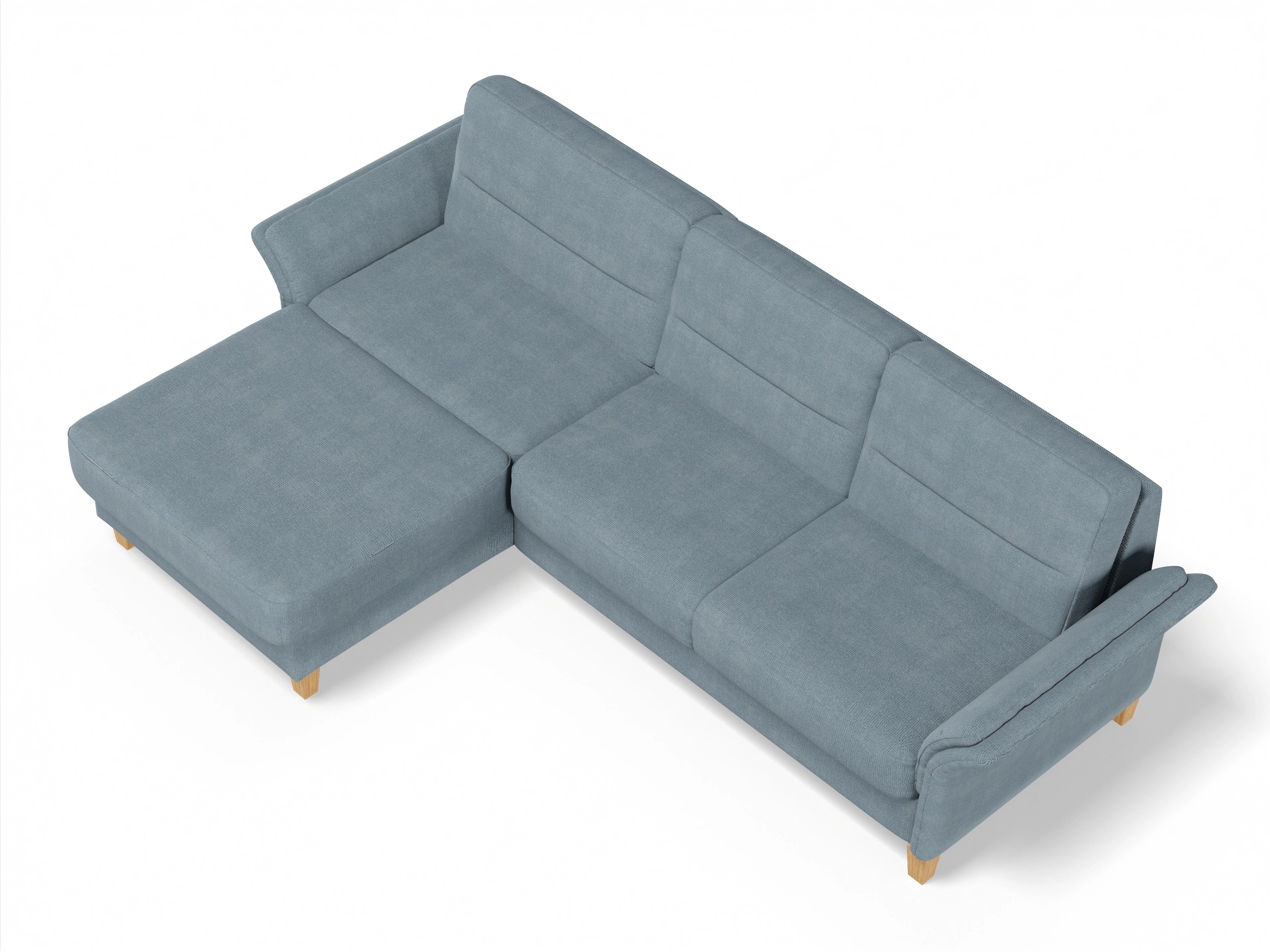 Das Ecksofa besteht aus einem Longchair mit Armlehne links und einem 2-Sitzer mit Armlehne rechts.